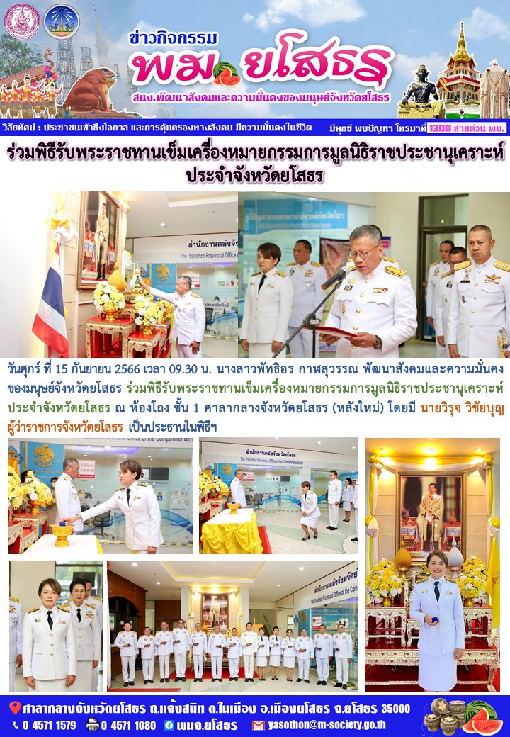 ร่วมพิธีรับพระราชทานเข็มเครื่องหมายกรรมการมูลนิธิราชประชานุเคราะห์ ประจำจังหวัดยโสธร (15 กันยายน 2566)