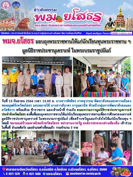 วันที่ 1 ต.ค. 2566 (18:25 น.)วันที่ 15 กันยายน 2566 เวลา 13.00 น. นางสาวพัทธิอร กาฬสุวรรณ พัฒนาสังคมและความมั่นคง ของมนุษย์จังหวัดยโสธร มอบหมายให้ นางสาวสันาดา การุณยวนิช หัวหน้ากลุ่มการพัฒนาสังคมและสวัสดิการ พร้อมด้วย ข้าราชการ และเจ้าหน้าที่ ร่วมกับ คณะกรรมการมูลนิธิราชประชานุเคราะห์ ประจำจังหวัดยโสธร ลงพื้นที่มอบถุงพระราชทานให้แก่นักเรียนทุนพระราชทานเพื่อการศึกษาสงเคราะห์ มูลนิธิราชประชานุเคราะห์ ในพระบรมราชูปถัมภ์ เพื่อสร้างขวัญและกำลังใจให้แก่นักเรียนทุน ฯ โดยมี ชมรมแม่บ้านมหาดไทยจังหวัดยโสธร หน่วยานภาครัฐ องค์กรปกครองส่วนท้องถิ่น เข้าร่วม ในพื้นที่ อำเภอค้อวัง และอำเภอคำเขื่อนแก้ว รวมจำนวน 5 ราย