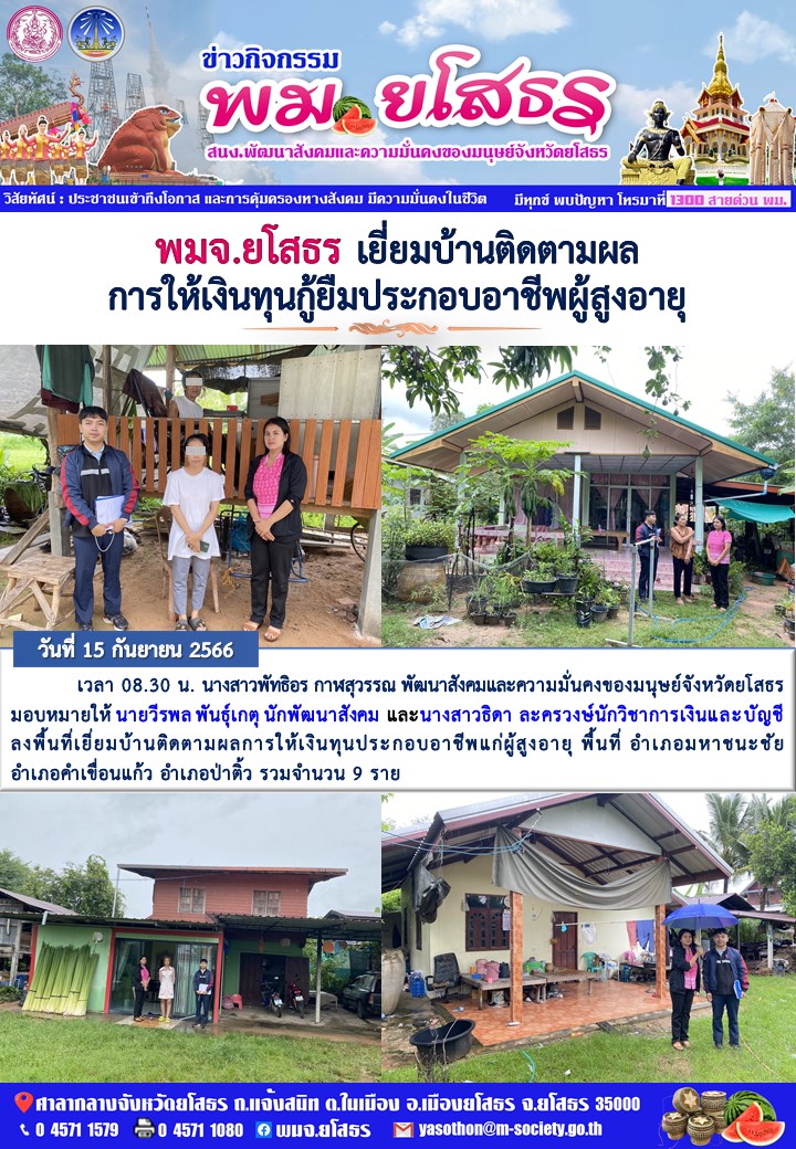 พมจ.ยโสธร เยี่ยมบ้านติดตามผล การให้เงินทุนกู้ยืมประกอบอาชีพผู้สูงอายุ (15 กันยายน 2566)