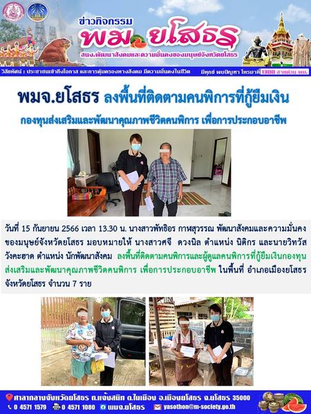 วันที่ 1 ต.ค. 2566 (18:27 น.)วันที่ 15 กันยายน 2566 เวลา 13.30 น. นางสาวพัทธิอร กาฬสุวรรณ พัฒนาสังคมและความมั่นคงของมนุษย์จังหวัดยโสธร มอบหมายให้ นางสาวศจี ดวงนิล ตำแหน่ง นิติกร และนายวิทวัส วังคะฮาด ตำแหน่ง นักพัฒนาสังคม ลงพื้นที่ติดตามคนพิการและผู้ดูแลคนพิการที่กู้ยืมเงินกองทุนส่งเสริมและพัฒนาคุณภาพชีวิตคนพิการ เพื่อการประกอบอาชีพ ในพื้นที่ อำเภอเมืองยโสธร จังหวัดยโสธร จำนวน 7 ราย