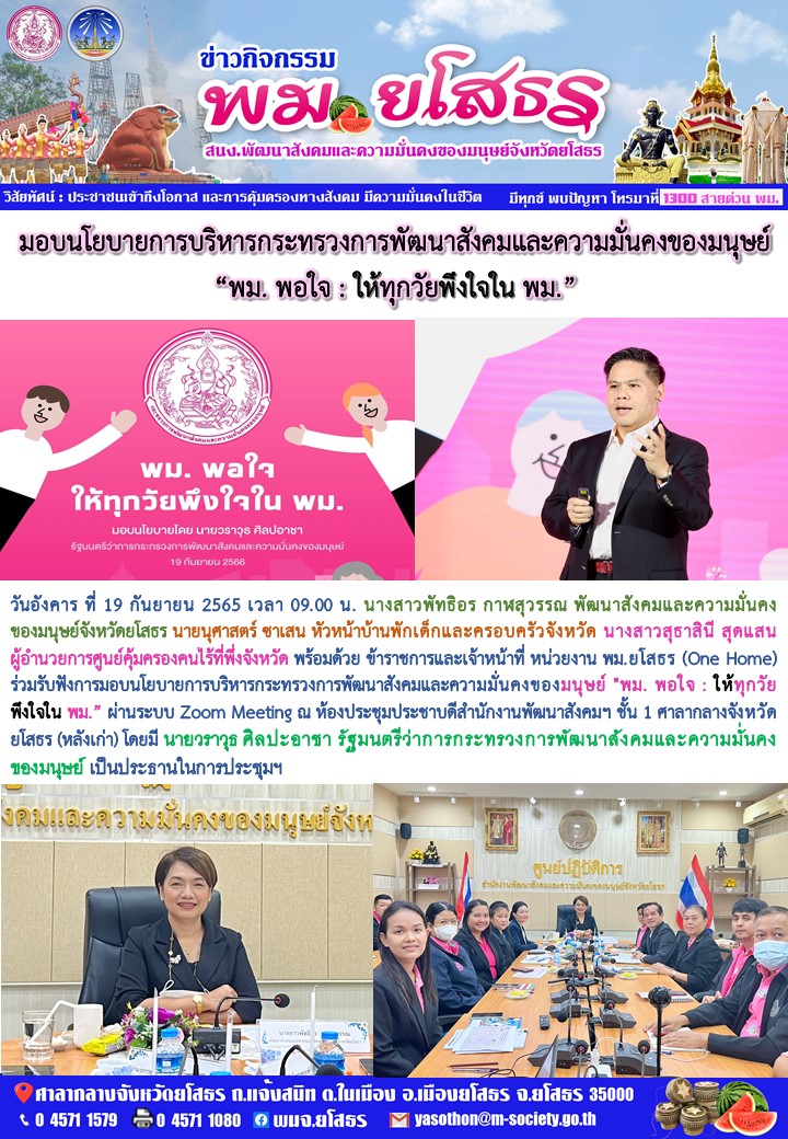 วันที่ 1 ต.ค. 2566 (19:00 น.)วันอังคาร ที่ 19 กันยายน 2565 เวลา 09.00 น. นางสาวพัทธิอร กาฬสุวรรณ พัฒนาสังคมและความมั่นคงของมนุษย์จังหวัดยโสธร นายนุศาสตร์ ซาเสน หัวหน้าบ้านพักเด็กและครอบครัวจังหวัด นางสาวสุธาสินี สุดแสน ผู้อำนวยการศูนย์คุ้มครองคนไร้ที่พึ่งจังหวัด พร้อมด้วย ข้าราชการและเจ้าหน้าที่ หน่วยงาน พม.ยโสธร (One Home) ร่วมรับฟังการมอบนโยบายการบริหารกระทรวงการพัฒนาสังคมและความมั่นคงของมนุษย์ "พม. พอใจ : ให้ทุกวัยพึงใจใน พม.” ผ่านระบบ Zoom Meeting ณ ห้องประชุมประชาบดีสำนักงานพัฒนาสังคมฯ ชั้น 1 ศาลากลางจังหวัดยโสธร (หลังเก่า) โดยมี นายวราวุธ ศิลปอาชา รัฐมนตรีว่าการกระทรวงการพัฒนาสังคมและความมั่นคงของมนุษย์ เป็นประธานในการประชุมฯ