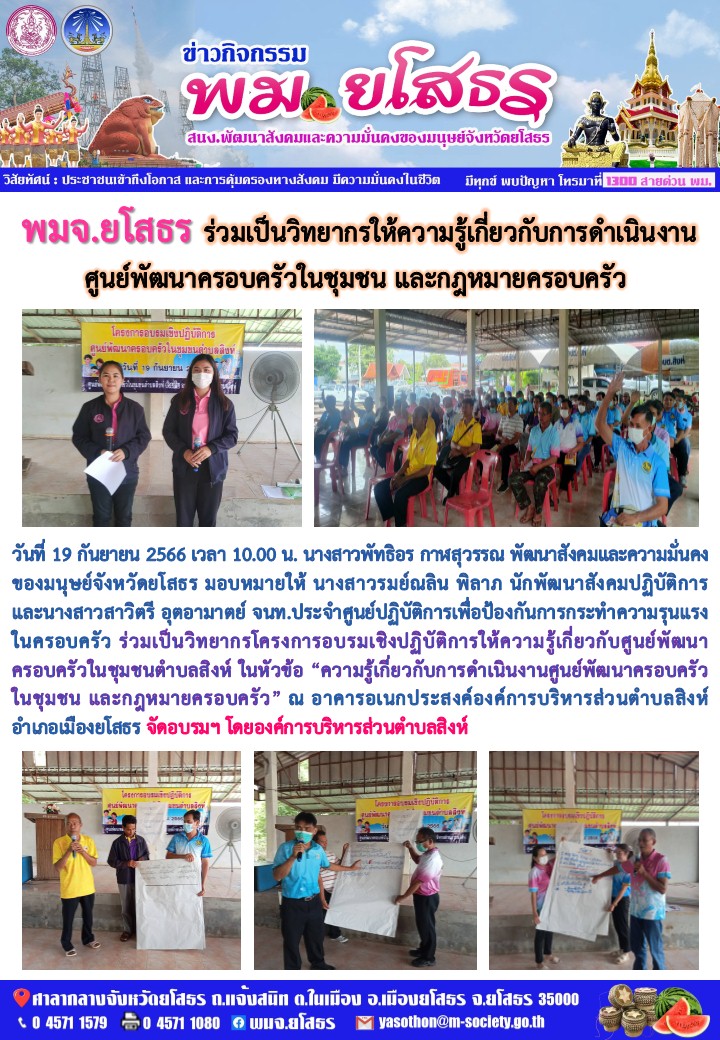 วันที่ 1 ต.ค. 2566 (19:03 น.)วันที่ 19 กันยายน 2566 เวลา 10.00 น. นางสาวพัทธิอร กาฬสุวรรณ พัฒนาสังคมและความมั่นคง ของมนุษย์จังหวัดยโสธร มอบหมายให้ นางสาวรมย์ณลิน พิลาภ นักพัฒนาสังคมปฏิบัติการ และนางสาวสาวิตรี อุตอามาตย์ จนท.ประจำศูนย์ปฏิบัติการเพื่อป้องกันการกระทำความรุนแรง ในครอบครัว ร่วมเป็นวิทยากรโครงการอบรมเชิงปฏิบัติการให้ความรู้เกี่ยวกับศูนย์พัฒนาครอบครัวในชุมชนตำบลสิงห์ ในหัวข้อ “ความรู้เกี่ยวกับการดำเนินงานศูนย์พัฒนาครอบครัว ในชุมชน และกฎหมายครอบครัว” ณ อาคารอเนกประสงค์องค์การบริหารส่วนตำบลสิงห์ อำเภอเมืองยโสธร จัดอบรมฯ โดยองค์การบริหารส่วนตำบลสิงห์