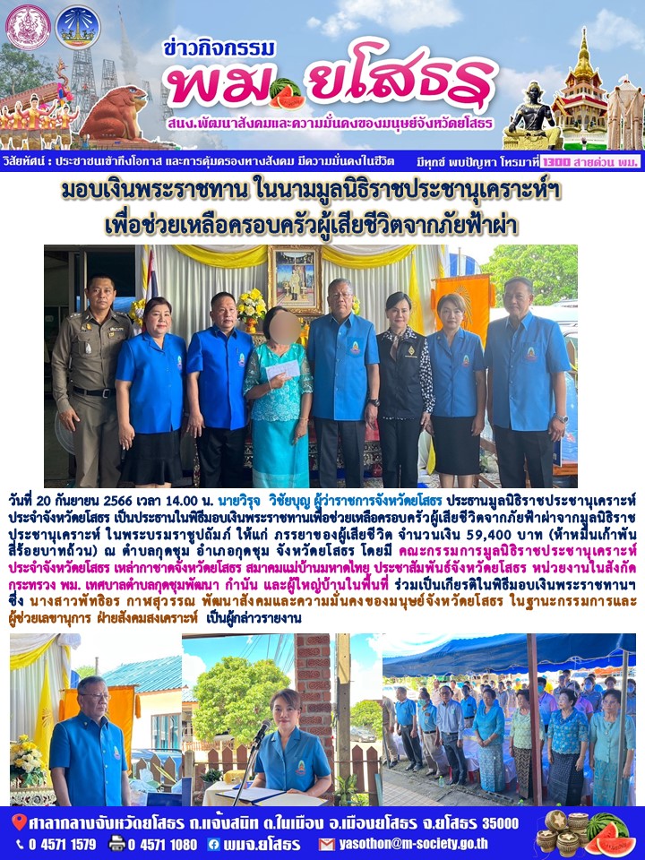 วันที่ 1 ต.ค. 2566 (19:15 น.)วันที่ 20 กันยายน 2566 เวลา 14.00 น. นายวิรุจ วิชัยบุญ ผู้ว่าราชการจังหวัดยโสธร ประธานมูลนิธิราชประชานุเคราะห์ประจำจังหวัดยโสธร เป็นประธานในพิธีมอบเงินพระราชทานเพื่อช่วยเหลือครอบครัวผู้เสียชีวิตจากภัยฟ้าผ่าจากมูลนิธิราชปุระชานุเคราะห์ ในพระบรมราชปถัมภ์ ให้แก่ ภรรยาข องผู้เสียชีวิต จำนวนเงิน 59,400 บาท (ห้าหมื่นเก้าพันสีร้อยบาทถ้วน) ณ ตำบลกุดชุม อำเภอกุดชุม จังหวัดยโสธร โดยมี คณะกรรมการมูลนิธิราชประชานุเคราะห์ประจำจังหวัดยโสธร เหล่ากาชาดจังหวัดโสธร สมาคมแม่บ้านมหาดไทย ประชาสัมพันธ์จังหวัดยโสธร หน่วยงานในสังกัดกระทรวง พม. เทศบาลตำบลกุดชุมพัฒนา กำนัน และผู้ใหญ่บ้านในพื้นที่ ร่วมเป็นเกียรติในพิธีมอบเงินพระราชทานฯ ซึ่ง นางสาวพัทธิอร กาฬสุวรรณ พัฒนาสังคมและความมั่นคง ของมนุษย์จังหวัดยโสธร ในฐานะกรรมการและผู้ช่วยเลขานุการ ฝ่ายสังคมสงเคราะห์ เป็นผู้กล่าวรายงาน