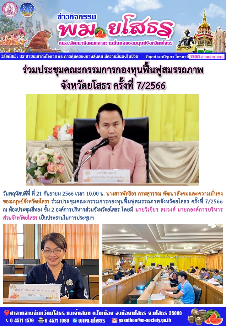 ร่วมประชุมคณะกรรมการกองทุนฟื้นฟูสมรรถภาพจังหวัดยโสธร ครั้งที่ 7/2566 (21 กันยายน 2566)