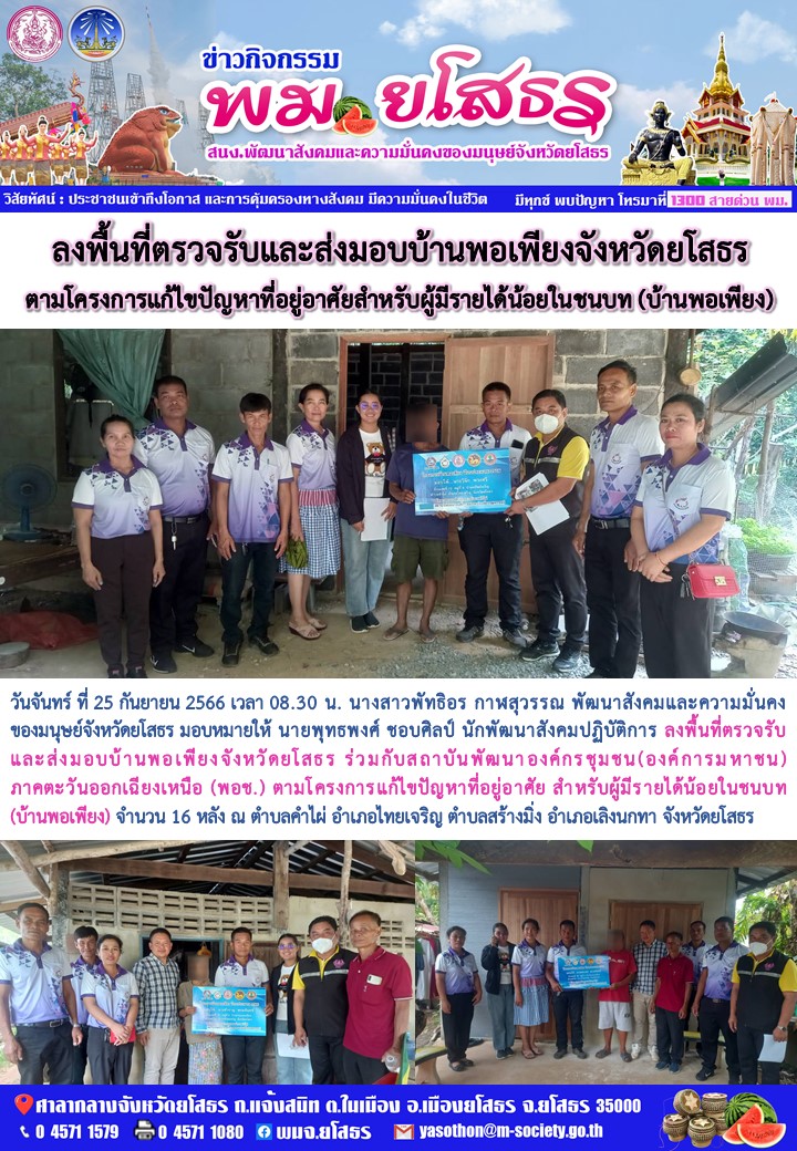 พมจ.ยโสธร ลงพื้นที่ตรวจรับและส่งมอบบ้านพอเพียงจังหวัดยโสธร (25 กันยายน 2566)