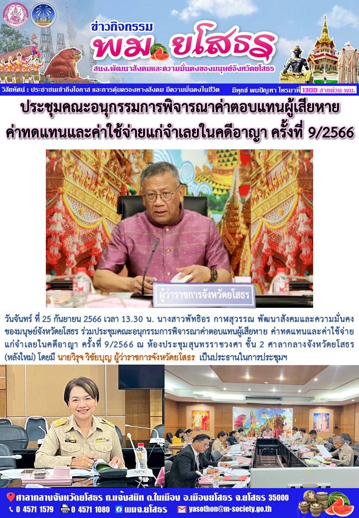 วันที่ 1 ต.ค. 2566 (19:52 น.)วันจันทร์ ที่ 25 กันยายน 2566 เวลา 13.30 น. นางสาวพัทธิอร กาฬสุวรรณ พัฒนาสังคมและความมั่นคงของมนุษย์จังหวัดยโสธร ร่วมประชุมคณะอนุกรรมการพิจารณาค่าตอบแทนผู้เสียหาย ค่าทดแทนและค่าใช้จ่ายแก่จำเลยในคดีอาญา ครั้งที่ 9/2566 ณ ห้องประชุมสุนทรราชวงศา ชั้น 2 ศาลากลางจังหวัดยโสธร (หลังใหม่) โดยมี นายวิรุจ วิชัยบุญ ผู้ว่าราชการจังหวัดยโสธร เป็นประธานในการประชุมฯ