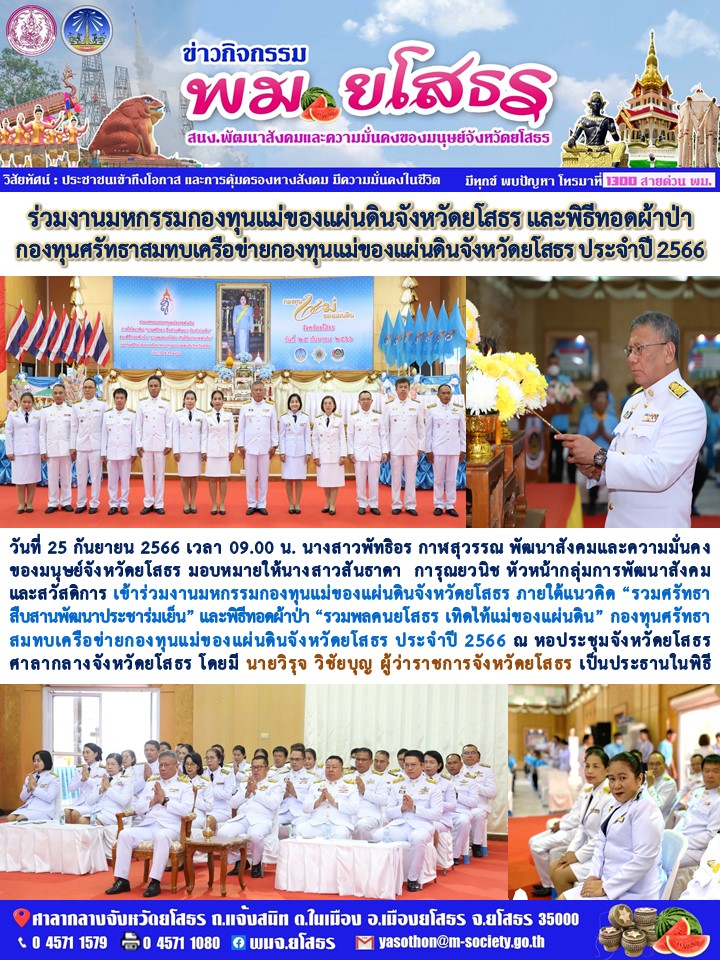 ร่วมงานมหกรรมกองทุนแม่ของแผ่นดินจังหวัดยโสธร ภายใต้แนวคิด “รวมศรัทธา สืบสานพัฒนาประชาร่มเย็น” และพิธีทอดผ้าป่า “รวมพลคนยโสธร เทิดไท้แม่ของแผ่นดิน” (25 กันยายน 2566)