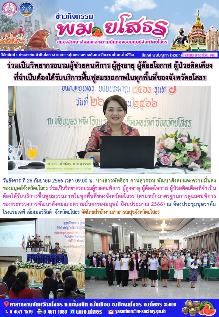 ร่วมเป็นวิทยากรอบรมผู้ช่วยคนพิการ ผู้สูงอายุ ผู้ด้อยโอกาส ผู้ป่วยติดเตียงที่จำเป็นต้องได้รับบริการฟื้นฟูสมรรถภาพในทุกพื้นที่ของจังหวัดยโสธร (26 กันยายน 2566)