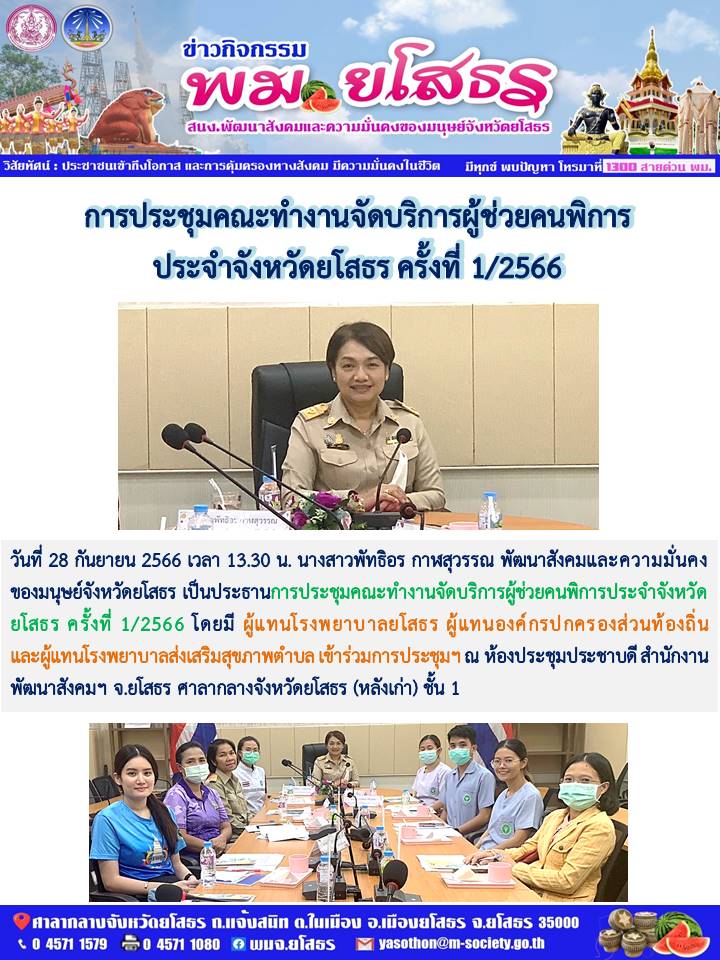 วันที่ 1 ต.ค. 2566 (20:42 น.)วันที่ 28 กันยายน 2566 เวลา 13.30 น. นางสาวพัทธิอร กาฬสุวรรณ พัฒนาสังคมและความมั่นคงของมนุษย์จังหวัดยโสธร เป็นประธานการประชุมคณะทำงานจัดบริการผู้ช่วยคนพิการประจำจังหวัดยโสธร ครั้งที่ 1/2566 โดยมี ผู้แทนโรงพยาบาลยโสธร ผู้แทนองค์กรปกครองส่วนท้องถิ่น และผู้แทนโรงพยาบาลส่งเสริมสุขภาพตำบล เข้าร่วมการประชุมฯ ณ ห้องประชุมประชาบดี สำนักงานพัฒนาสังคมฯ จ.ยโสธร ศาลากลางจังหวัดยโสธร (หลังเก่า) ชั้น 1