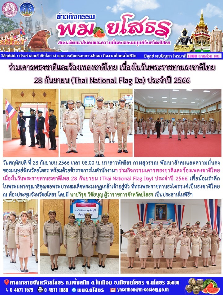 วันที่ 1 ต.ค. 2566 (20:52 น.)วันพฤหัสบดี ที่ 28 กันยายน 2566 เวลา 08.00 น. นางสาวพัทธิอร กาฬสุวรรณ พัฒนาสังคมและความมั่นคงของมนุษย์จังหวัดยโสธร พร้อมด้วยข้าราชการในสำนักงานฯ ร่วมกิจกรรมเคารพธงชาติและร้องเพลงชาติไทย เนื่องในวันพระราชทานธงชาติไทย 28 กันยายน (Thai National Flag Day) ประจำปี 2566 เพื่อน้อมรำลึกในพระมหากรุณาธิคุณขอพระบาทสมเด็จพระมงกุฎเกล้าเจ้าอยู่หัว ที่ทรงพระราชทานธงไตรรงค์เป็นธงชาติไทย ณ ห้องประชุมจังหวัดยโสธร โดยมี นายวิรุจ วิชัยบุญ ผู้ว่าราชการจังหวัดยโสธร เป็นประธานในพิธีฯ