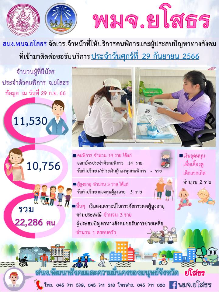 สนง.พมจ.ยโสธร จัดเวรเจ้าหน้าที่ให้บริการคนพิการและผู้ประสบปัญหาทางสังคม ที่เข้ามาติดต่อขอรับบริการ (29 กันยายน 2566)