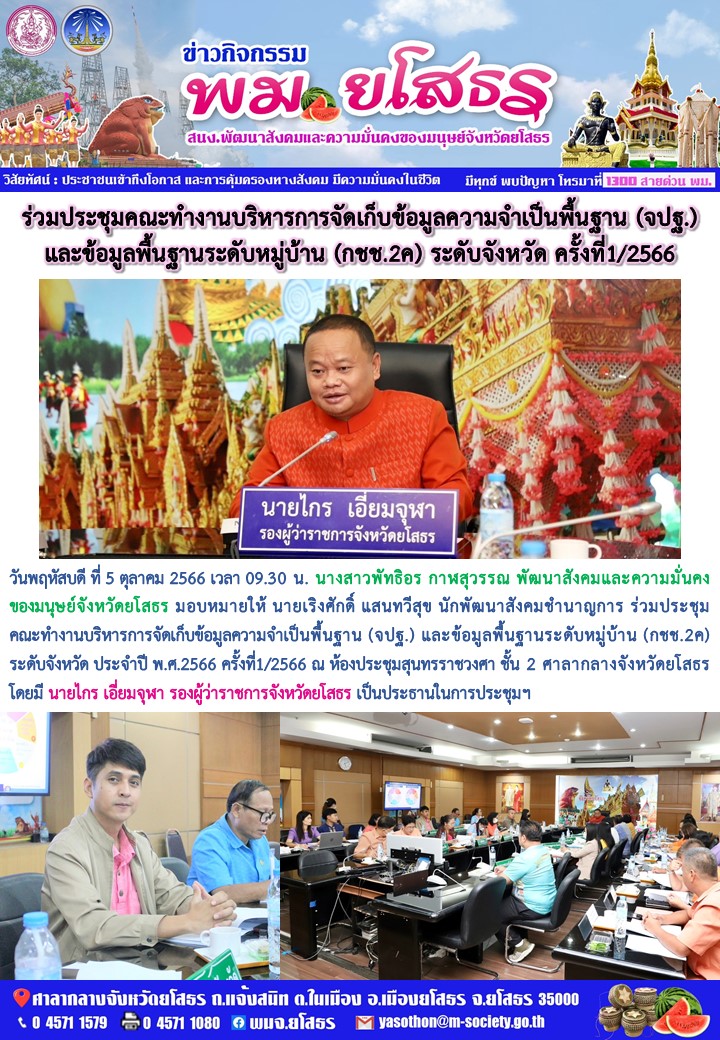 ร่วมประชุมคณะทำงานบริหารการจัดเก็บข้อมูลความจำเป็นพื้นฐาน (จปฐ.) และข้อมูลพื้นฐานระดับหมู่บ้าน (กชช.2ค) ระดับจังหวัด (5 ตุลาคม 2566)