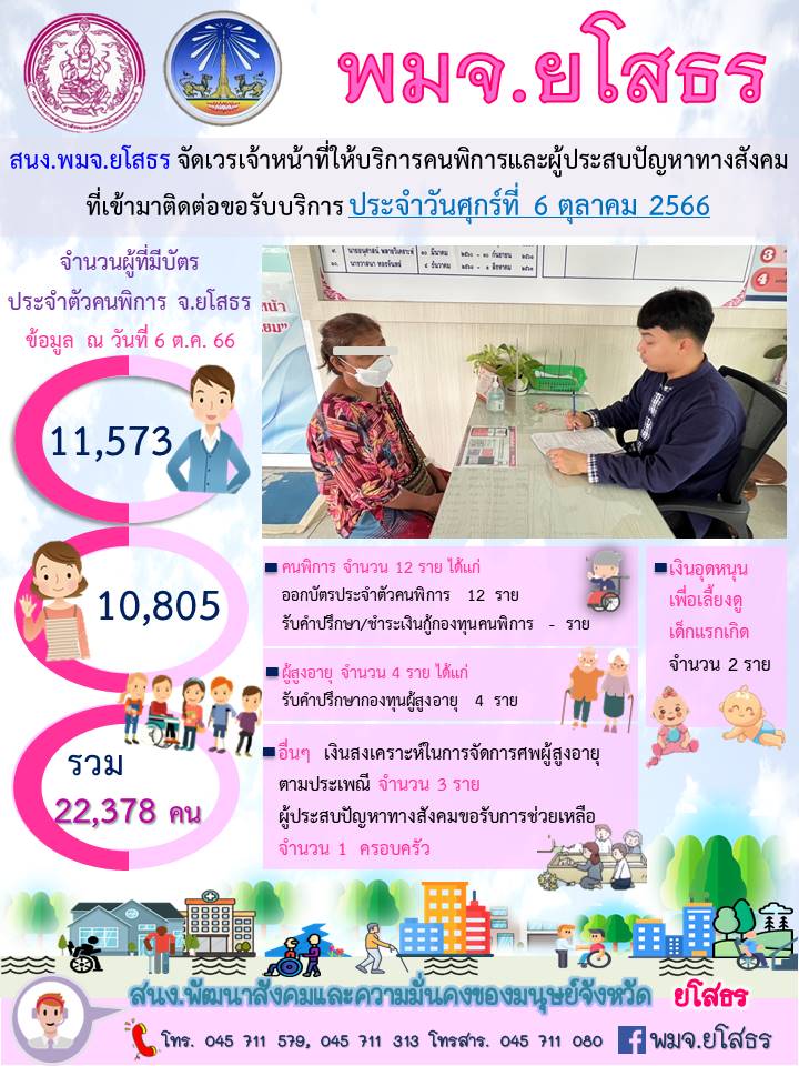 สนง.พมจ.ยโสธร จัดเวรเจ้าหน้าที่ให้บริการคนพิการและผู้ประสบปัญหาทางสังคม ที่เข้ามาติดต่อขอรับบริการ (6 ตุลาคม 2566)