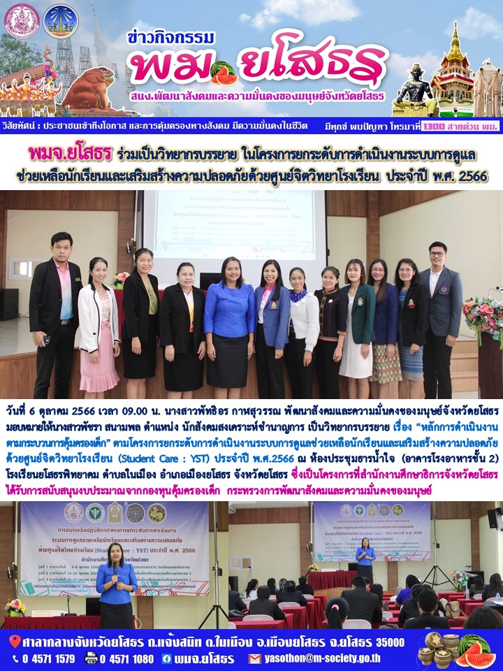 วันที่ 9 ต.ค. 2566 (14:12 น.)วันที่ 6 ตุลาคม 2566 เวลา 09.00 น. นางสาวพัทธิอร กาฬสุวรรณ พัฒนาสังคมและความมั่นคงของมนุษย์จังหวัดยโสธร มอบหมายให้นางสาวพัชรา สนามพล ตำแหน่ง นักสังคมสงเคราะห์ชำนาญการ เป็นวิทยากรบรรยาย เรื่อง “หลักการดำเนินงาน ตามกระบวนการคุ้มครองเด็ก” ตามโครงการยกระดับการดำเนินงานระบบการดูแลช่วยเหลือนักเรียนและเสริมสร้างความปลอดภัย ด้วยศูนย์จิตวิทยาโรงเรียน (Student Care : YST) ประจำปี พ.ศ.2566 ณ ห้องประชุมธารน้ำใจ (อาคารโรงอาหารชั้น 2) โรงเรียนยโสธรพิทยาคม ตำบลในเมือง อำเภอเมืองยโสธร จังหวัดยโสธร ซึ่งเป็นโครงการที่สำนักงานศึกษาธิการจังหวัดยโสธร ได้รับการสนับสนุนงบประมาณจากกองทุนคุ้มครองเด็ก กระทรวงการพัฒนาสังคมและความมั่นคงของมนุษย์