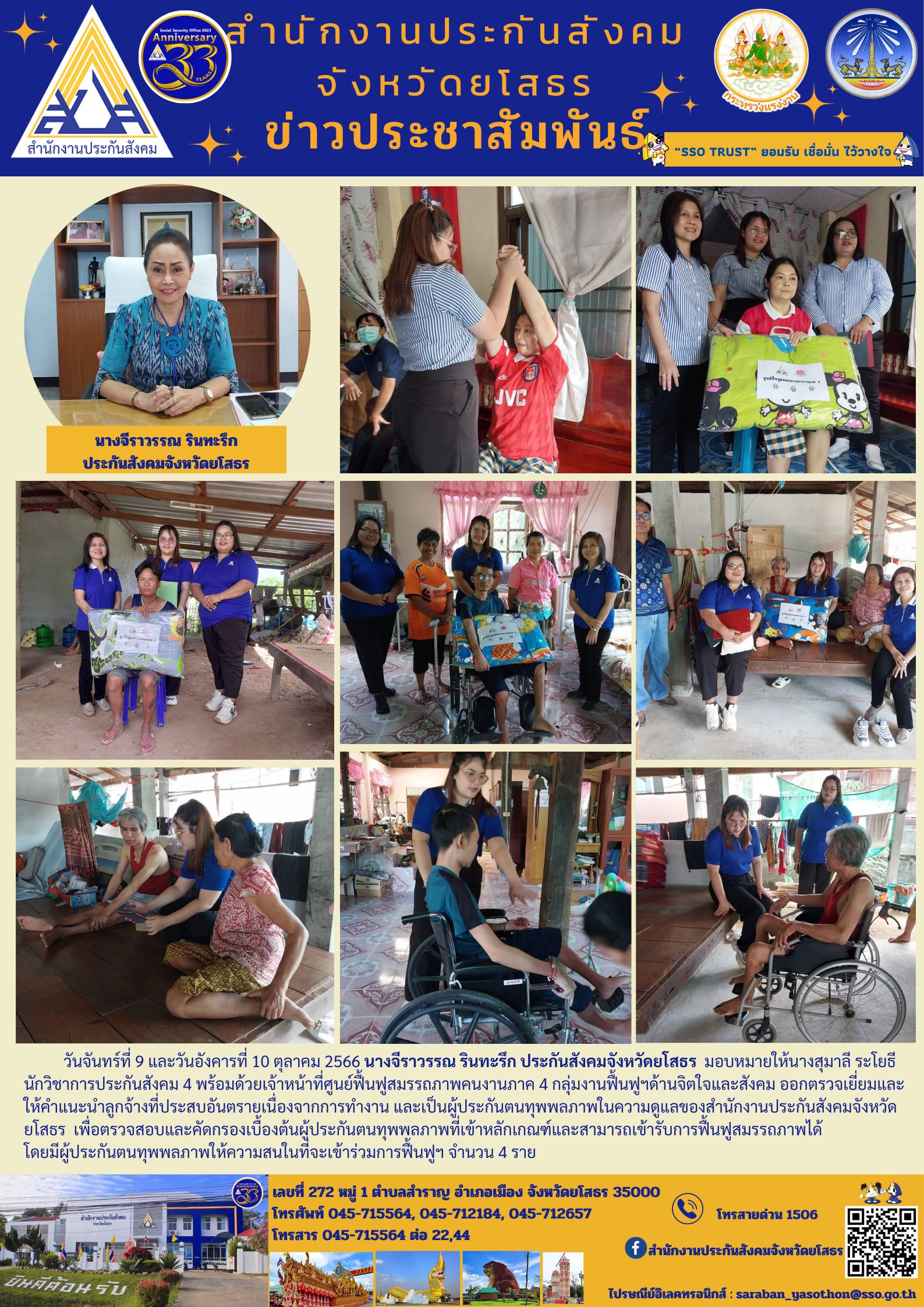 วันจันทร์ที่ 9 และวันอังคารที่ 10 ตุลาคม 2566 นางจีราวรรณ รินทะรึก ประกันสังคมจังหวัดยโสธร มอบหมายให้นางสุมาลี ระโยธี นักวิชาการประกันสังคม 4 พร้อมด้วยเจ้าหน้าที่ศูนย์ฟื้นฟูสมรรถภาพคนงานภาค 4 กลุ่มงานฟื้นฟูฯด้านจิตใจและสังคม ออกตรวจเยี่ยมและ ให้คำแ