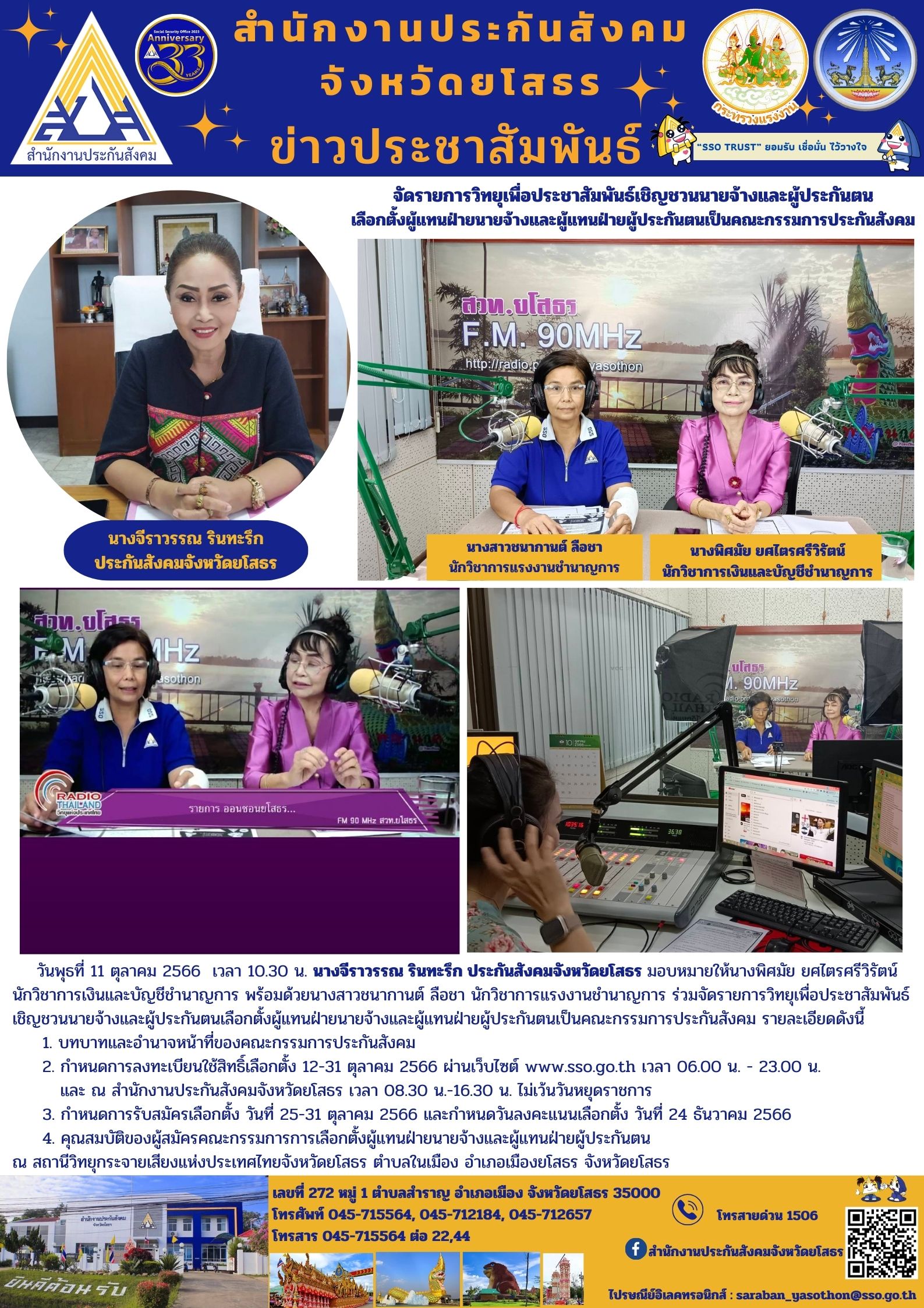 วันพุธที่ 11 ตุลาคม 2566 เวลา 10.30 น. นางจีราวรรณ รินทะรึก ประกันสังคมจังหวัดยโสธร มอบหมายให้นางพิศมัย ยศไตรศรีวิรัตน์ นักวิชาการเงินและบัญชีชำนาญการ พร้อมด้วยนางสาวชนากานต์ ลือชา นักวิชาการแรงงานชำนาญการ ร่วมจัดรายการวิทยุเพื่อประชาสัมพันธ์เชิญชวน