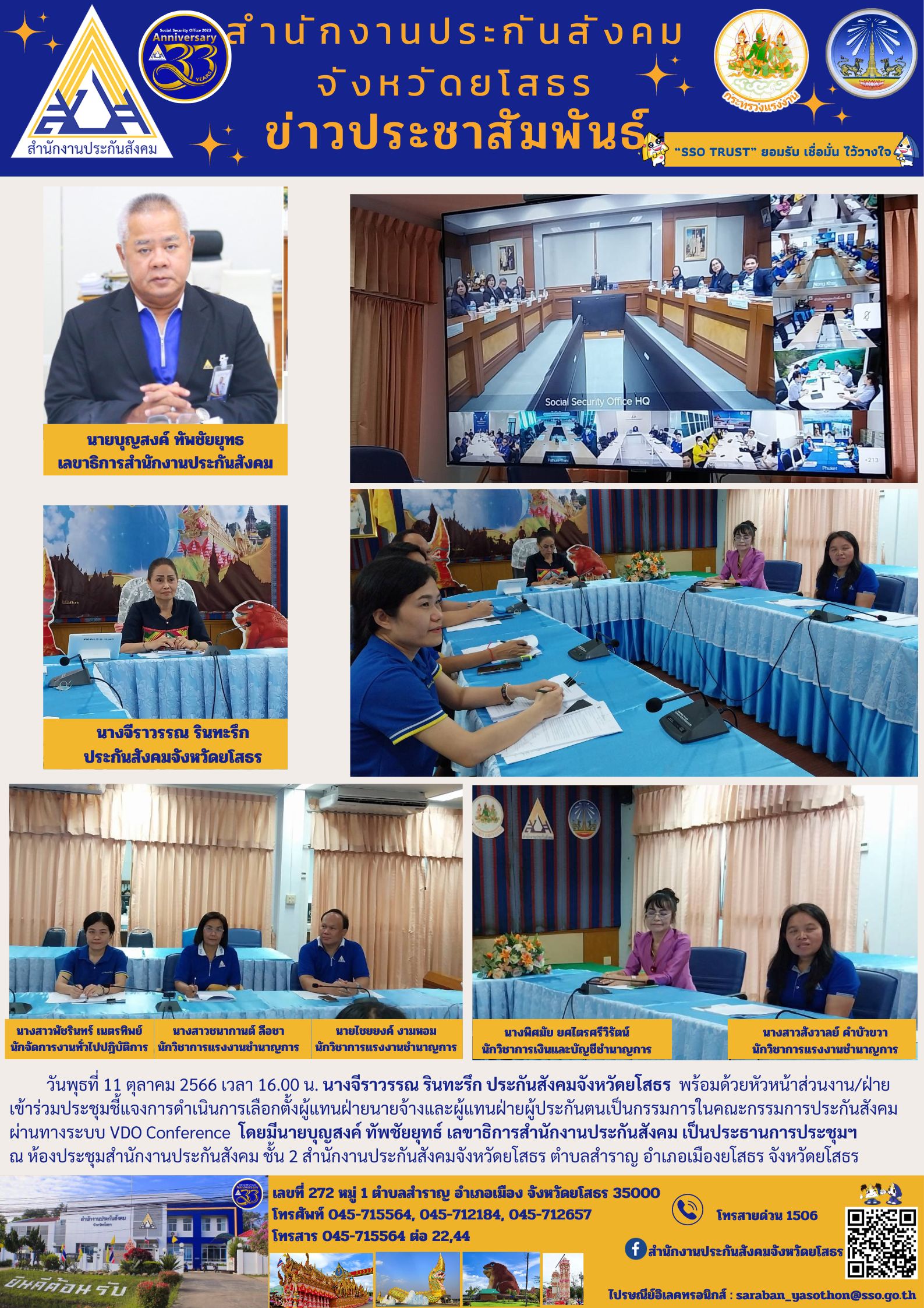 วันพุธที่ 11 ตุลาคม 2566 เวลา 16.00 น. นางจีราวรรณ รินทะรึก ประกันสังคมจังหวัดยโสธร พร้อมด้วยหัวหน้าส่วนงาน/ฝ่าย เข้าร่วมประชุมชี้แจงการดำเนินการเลือกตั้งผู้แทนฝ่ายนายจ้างและผู้แทนฝ่ายผู้ประกันตนเป็นกรรมการในคณะกรรมการประกันสังคม ผ่านทางระบบ VDO Co