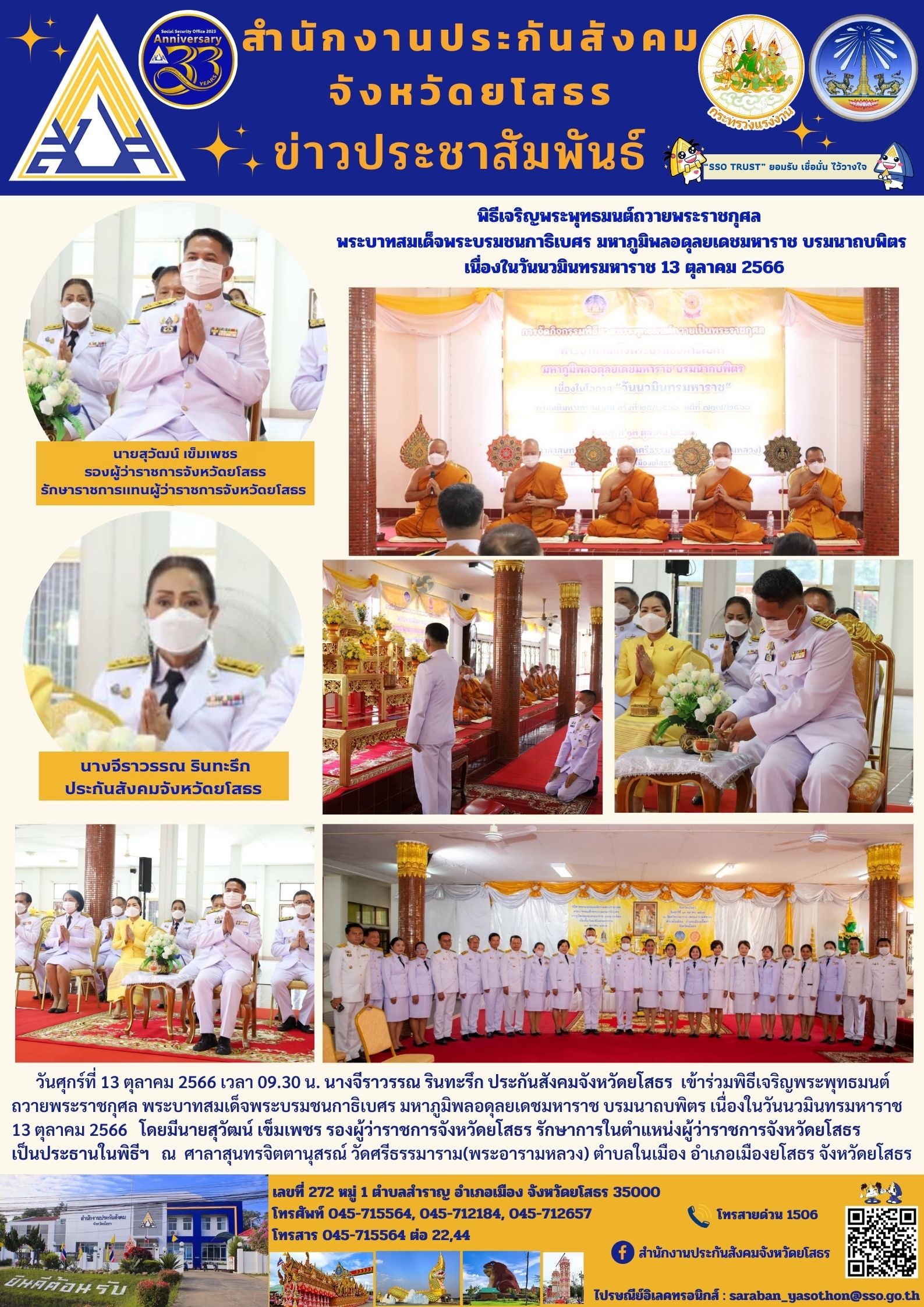วันศุกร์ที่ 13 ตุลาคม 2566 เวลา 09.30 น. นางจีราวรรณ รินทะรึก ประกันสังคมจังหวัดยโสธร เข้าร่วมพิธีเจริญพระพุทธมนต์ถวายพระราชกุศล พระบาทสมเด็จพระบรมชนกาธิเบศร มหาภูมิพลอดุลยเดชมหาราช บรมนาถบพิตร เนื่องในวันนวมินทรมหาราช 13 ตุลาคม 2566
