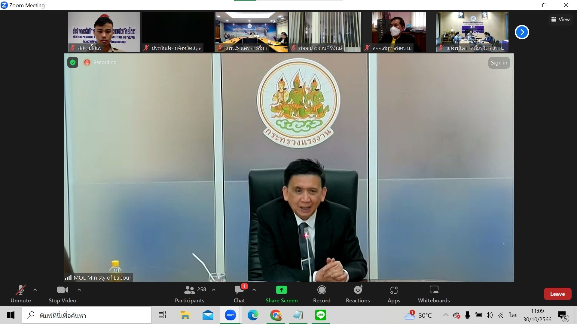 วันที่ 31 ต.ค. 2566 (09:11 น.)วันจันทร์ที่ 30 ตุลาคม 2566 เวลา 11.00 น. นายพนมพร ชวนอุดม สวัสดิการและคุ้มครองแรงงานจังหวัดยโสธร มอบหมายให้นางสาวสุจิตตรา เยาวราช นักวิชาการแรงงานชำนาญการ เข้าร่วมประชุมหัวหน้าส่วนราชการสังกัดกระทรวงแรงงานผ่านระบบออนไลน์ Zoom meeting เกี่ยวกับแนวทางการดำเนินงานขอรับสิทธิประโยชน์ของแรงงานไทยที่กลับจากอิสราเอล โดยมีนายไพโรจน์ โชติเสถียร ปลัดกระทรวงแรงงาน เป็นประธานการประชุม ณ ห้องประชุมสำนักงานสวัสดิการและคุ้มครองแรงงานจังหวัดยโสธร ศาลากลางจังหวัดยโสธร ชั้น 1 (หลังใหม่) อำเภอเมืองยโสธร จังหวัดยโสธร