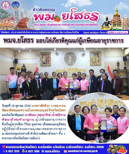 วันที่ 3 พ.ย. 2566 (23:07 น.)วันพุธที่ 18 ตุลาคม 2566 นางสาวพัทธิอร กาฬสุวรรณ พัฒนาสังคมและความมั่นคงของมนุษย์จังหวัดยโสธร มอบโล่เกียรติคุณแก่ นางลินจง เวฬุวนารักษ์ เจ้าพนักงานพัฒนาสังคมชำนาญงาน ผู้เกษียณอายุราชการซึ่งเป็นผู้พากเพียร วิริยะ อุตสาหะ เสียสละและอุทิศตนปฏิบัติหน้าที่ ตามความมุ่งหมายของทางราชการ ณ ห้องประชุมประชาบดี สำนักงานพัฒนาสังคมฯ ชั้น 1 ศาลากลางจังหวัดยโสธร (หลังเก่า)