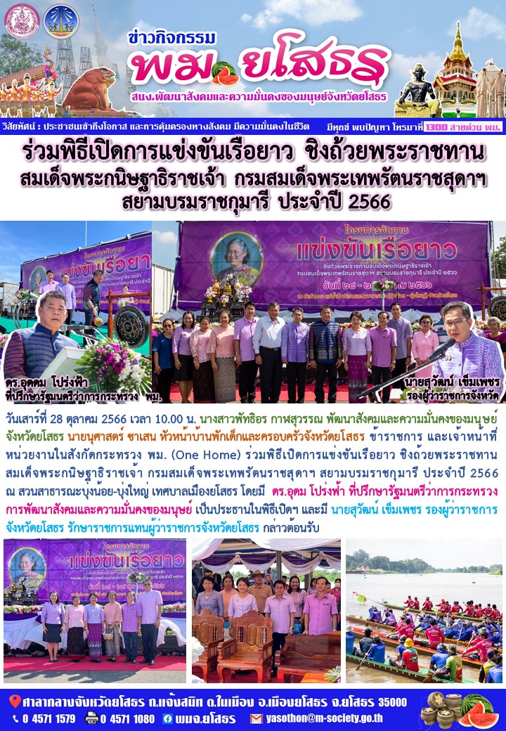 วันที่ 4 พ.ย. 2566 (00:25 น.)วันเสาร์ที่ 28 ตุลาคม 2566 เวลา 10.00 น. นางสาวพัทธิอร กาฬสุวรรณ พัฒนาสังคมและความมั่นคงของมนุษย์จังหวัดยโสธร นายนุศาสตร์ ซาเสน หัวหน้าบ้านพักเด็กและครอบครัวจังหวัดยโสธร ข้าราชการ และเจ้าหน้าที่ หน่วยงานในสังกัดกระทรวง พม. (One Home) ร่วมพิธีเปิดการแข่งขันเรือยาว ชิงถ้วยพระราชทานสมเด็จพระกนิษฐาธิราชเจ้า กรมสมเด็จพระเทพรัตนราชสุดาฯ สยามบรมราชกุมารี ประจำปี 2566 ณ สวนสาธารณะบุ่งน้อย-บุ่งใหญ่ เทศบาลเมืองยโสธร โดยมี ดร.อุดม โปร่งฟ้า ที่ปรึกษารัฐมนตรีว่าการกระทรวงการพัฒนาสังคมและความมั่นคงของมนุษย์ เป็นประธานในพิธีเปิดฯ และมี นายสุวัฒน์ เข็มเพชร รองผู้ว่าราชการจังหวัดยโสธร รักษาราชการแทนผู้ว่าราชการจังหวัดยโสธร กล่าวต้อนรับ