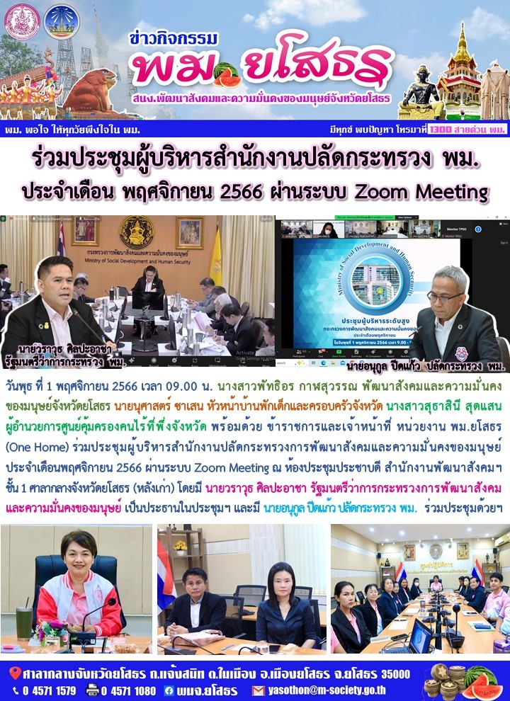แก้ไขโดย : [สำนักงานพัฒนาสังคมและความมั่นคงของมนุษย์จังหวัดยโสธร] วันที่ 10 พ.ย. 2566 (15:00 น.)วันพุธ ที่ 1 พฤศจิกายน 2566 เวลา 09.00 น. นางสาวพัทธิอร กาฬสุวรรณ พัฒนาสังคมและความมั่นคงของมนุษย์จังหวัดยโสธร นายนุศาสตร์ ซาเสน หัวหน้าบ้านพักเด็กและครอบครัวจังหวัด นางสาวสุธาสินี สุดแสน ผู้อำนวยการศูนย์คุ้มครองคนไร้ที่ พี่ งจังหวัด พร้อมด้วย ข้าราชการและเจ้าหน้าที่ หน่วยงาน พม.ยโสธร (One Home) ร่วมประชุมผู้บริหารสำนักงานปลัดกระทรวงการพัฒนาสังคมและความมั่นคงของมนุษย์ ประจำเดือนพฤศจิกายน 2566 ผ่านระบบ Zoom Meeting ณ ห้องประชุมประชาบดี สำนักงานพัฒนาสังคมฯ ชั้น 1 ศาลากลางจังหวัดยโสธร (หลังเก่า) โดยมี นายวราวุธ ศิลปะอาชา รัฐมนตรีว่าการกระทรวงการพัฒนาสังคม และความมั่นคงของมนุษย์ เป็นประธานในประชุมฯ และมี นายอนุกูล ปีดแก้ว ปลัดกระทรวง พม. ร่วมประชุมด้วยฯ