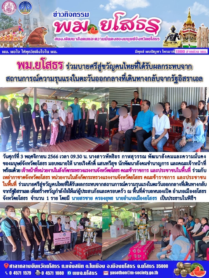 พมจ.ยดสธร ร่วมบายศรีสู่ขวัญคนไทยที่ได้รับผลกระทบจากสถานการณ์ความรุนแรงในตะวันออกกลางที่เดินทางกลับจากรัฐอิสราเอล (3 พฤศจิกายน 2566)