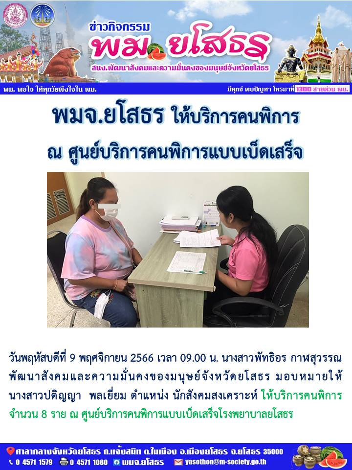 ให้บริการคนพิการ จำนวน 8 ราย ณ ศูนย์บริการคนพิการแบบเบ็ดเสร็จ โรงพยาบาลยโสธร (9 พฤศจิกายน 2566)
