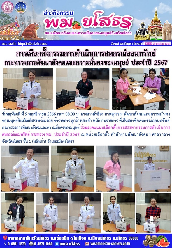 วันที่ 30 ธ.ค. 2566 (21:55 น.)วันพฤหัสบดี ที่ 9 พฤศจิกายน 2566 เวลา 08.00 น. นางสาวพัทธิอร กาฬสุวรรณ พัฒนาสังคมและความมั่นคงของมนุษย์จังหวัดยโสธรพร้อมด้วย ข้าราชการ ลูกจ้างประจำ พนักงานราชการ ที่เป็นสมาชิกสหกรณ์ออมทรัพย์กระทรวงการพัฒนาสังคมและความมั่นคงของมนุษย์ ร่วมลงคะแนนเลือกตั้งการสรรหากรรมการดำเนินการสหกรณ์ออมทรัพย์ กระทรวง พม. ประจำปี 2567 ณ หน่วยเลือกตั้ง สำนักงานพัฒนาสังคมฯ ศาลากลาง จังหวัดยโสธร ชั้น 1 (หลังเก่า) อำเภอเมืองยโสธร