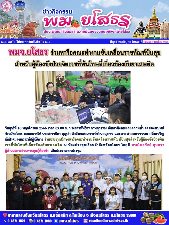 วันที่ 30 ธ.ค. 2566 (22:10 น.)วันศุกร์ที่ 10 พฤศจิกายน 2566 เวลา 09.00 น. นางสาวพัทธิอร กาฬสุวรรณ พัฒนาสังคมและความมั่นคงของมนุษย์ จังหวัดยโสธร มอบหมายให้ นางสาววนิดา บุญปก นักสังคมสงเคราะห์ชำนาญการ และนางสาวอมรวรรณ กลิ่นเจริญ นักสังคมสงเคราะห์ปฏิบัติการ ร่วมประชุมปรึกษาหารือคณะทำงานขับเคลื่อนราชทัณฑ์ปันสุขสำหรับผู้ต้องขังป่วยจิตเวชที่พ้นโทษที่เกี่ยวข้องกับยาเสพติด ณ ห้องประชุมเรือนจำจังหวัดยโสธร โดยมี นายไพลวัลย์ สุนทรา ผู้อำนวยการส่วนควบคุมผู้ต้องขัง เป็นประธานการประชุมฯ