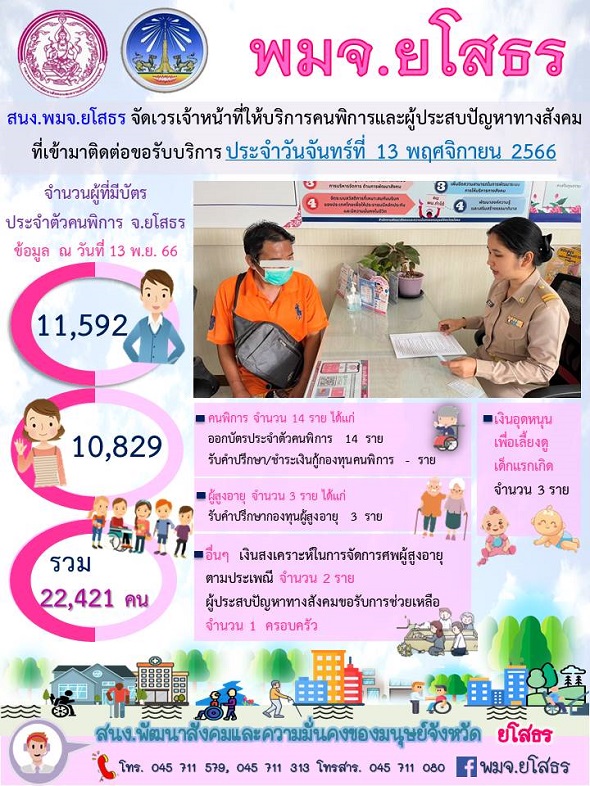 สนง.พมจ.ยโสธร จัดเวรเจ้าหน้าที่ให้บริการคนพิการและผู้ประสบปัญหาทางสังคม ที่เข้ามาติดต่อขอรับบริการ (13 พฤศจิกายน 2566)