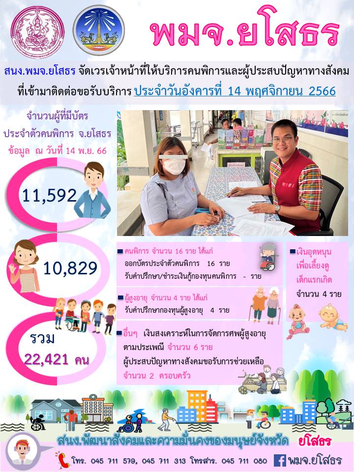 สนง.พมจ.ยโสธร จัดเวรเจ้าหน้าที่ให้บริการคนพิการและผู้ประสบปัญหาทางสังคม ที่เข้ามาติดต่อขอรับบริการ (14 พฤศจิกายน 2566)