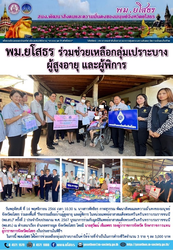 วันที่ 31 ธ.ค. 2566 (00:09 น.)วันพฤหัสบดี ที่ 16 พฤศจิกายน 2566 เวลา 10.30 น. นางสาวพัทธิอร กาพสุวรรณ พัฒนาสังคมและความมั่นคงของมนุษย์จังหวัดยโสธร ร่วมลงพื้นที่ "กิจกรรมเยี่ยมบ้านผู้สูงอายุ และผู้พิการ ในหน่วยแพทย์อาสาสมเด็จพระศรีนครินทราบรมราชชนนี (พอ.สว)" ครั้งที่ 2 ประจำปีงบประมาณ พ.ศ. 2567 บูรณาการร่วมกับมูลนิธิแพทย์อาสาสมเด็จพระศรีนครินทราบรมราชชนนี (พอ.สว) ณ ตำบลนาเวียง อำเภอทรายมูล จังหวัดยโสธร โดยมี นายสุวัฒน์ เข็มเพชร รองผู้ว่าราชการจังหวัด รักษาราชการแทนผู้ว่าราชการจังหวัดยโสธร เป็นประธานในพิธีฯ