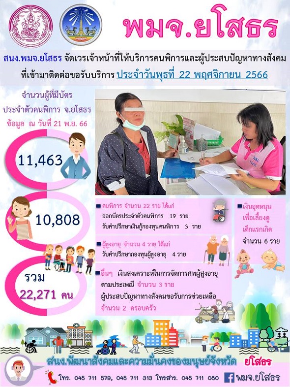 สนง.พมจ.ยโสธร จัดเวรเจ้าหน้าที่ให้บริการคนพิการและผู้ประสบปัญหาทางสังคม ที่เข้ามาติดต่อขอรับบริการ (22 พฤศจิกายน 2566)