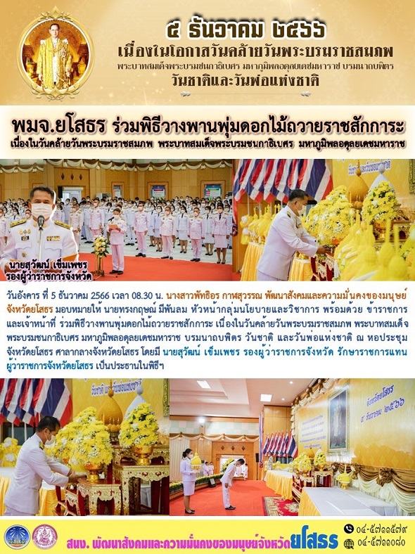 พมจ.ยโสธร ร่วมพิธีวางพานพุ่มดอกไม้ถวายราชสักการะ เนื่องในวันคล้ายวันพระบรมราชสมภพ พระบาทสมเด็จพระบรมชนกาธิเบศร มหาภูมิพลอดุลยเดชมหาราช บรมนาถบพิตร วันชาติ และวันพ่อแห่งชาติ (5 ธันวาคม 2566)