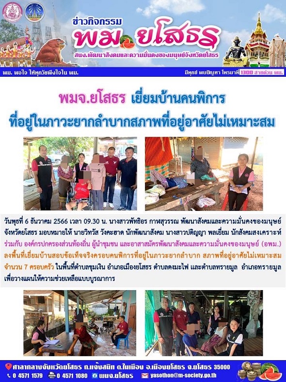 พมจ.ยโสธร ลงพื้นที่เยี่ยมบ้านสอบข้อเท็จจริงครอบคนพิการที่อยู่ในภาวะยากลำบาก สภาพที่อยู่อาศัยไม่เหมาะสม (ุ6 ธันวาคม 2566)