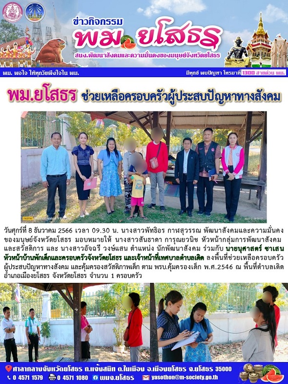 พม.ยโสธร ลงพื้นที่ช่วยเหลือครอบครัวผู้ประสบปัญหา ทางสังคม และคุ้มครองสวัสดิภาพเด็ก (8 ธันวาคม 2566)