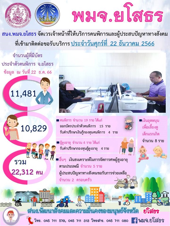 สนง.พมจ.ยโสธร จัดเวรเจ้าหน้าที่ให้บริการคนพิการและผู้ประสบปัญหาทางสังคม ที่เข้ามาติดต่อขอรับบริการ (22 ธันวาคม2566)