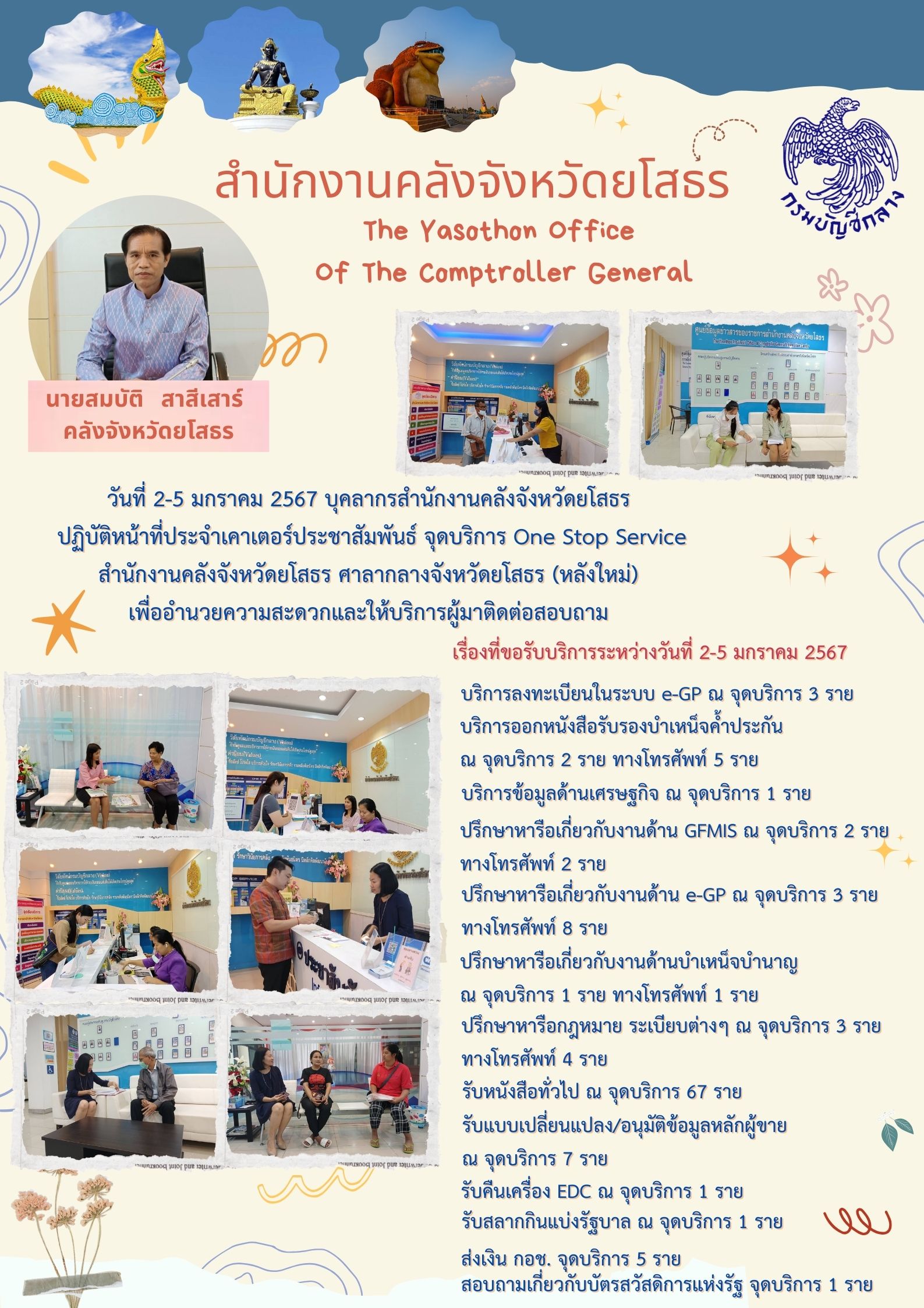 วันที่ 2-5 มกราคม 2567 บุคลากรสำนักงานคลังจังหวัดยโสธร ปฏิบัติหน้าที่ประจำเคาเตอร์ประชาสัมพันธ์ จุดบริการ One Stop Service สำนักงานคลังจังหวัดยโสธร ศาลากลางจังหวัดยโสธร (หลังใหม่) เพื่ออำนวยความสะดวกและให้บริการผู้มาติดต่อสอบถาม