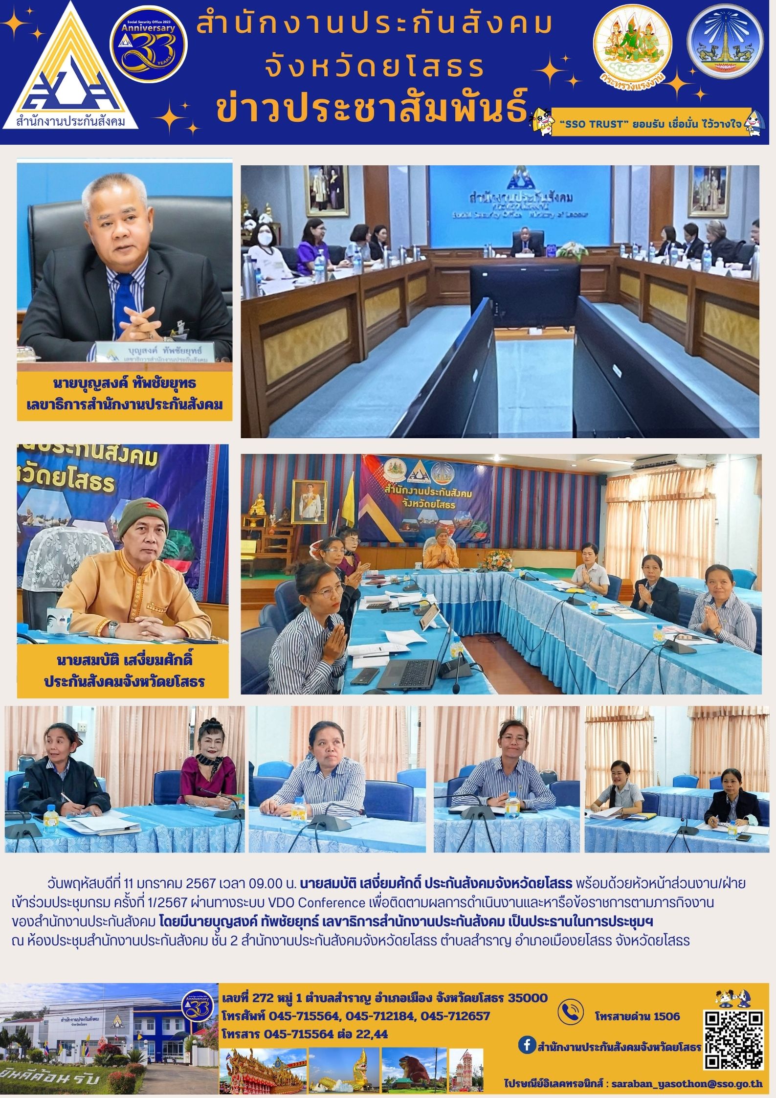 วันพฤหัสบดีที่ 11 มกราคม 2567 เวลา 09.00 น. นายสมบัติ เสงี่ยมศักดิ์ ประกันสังคมจังหวัดยโสธร พร้อมด้วยหัวหน้าส่วนงาน/ฝ่าย เข้าร่วมประชุมกรม ครั้งที่ 1/2567 ผ่านทางระบบ VDO Conference เพื่อติดตามผลการดำเนินงานและหารือข้อราชการตามภารกิจงาน ของสำนักงานป