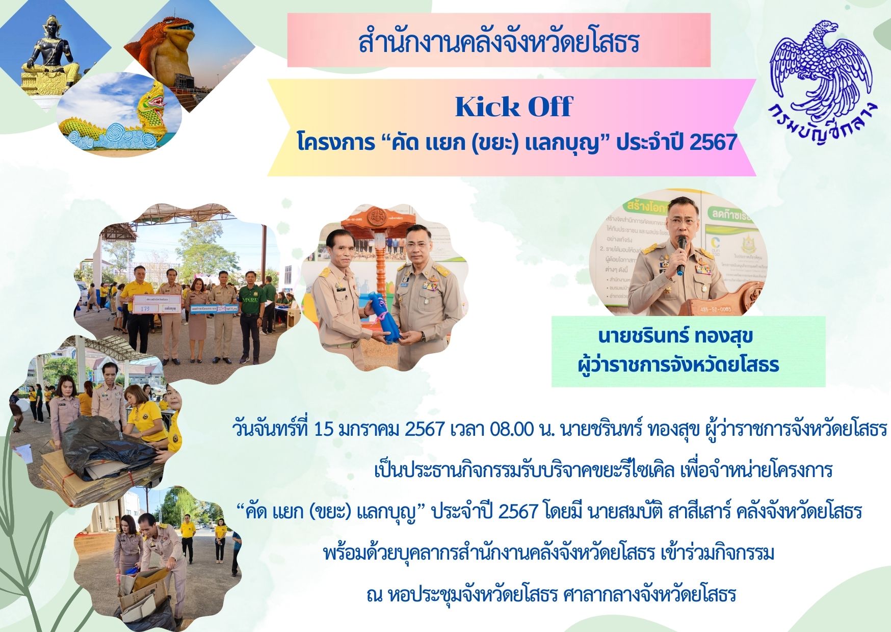 วันจันทร์ที่ 15 มกราคม 2567 เวลา 08.00 น. นายชรินทร์ ทองสุข ผู้ว่าราชการจังหวัดยโสธร เป็นประธานกิจกรรมรับบริจาคขยะรีไซเคิล เพื่อจำหน่ายโครงการ “คัด แยก (ขยะ) แลกบุญ” ประจำปี 2567 โดยมี นายสมบัติ สาสีเสาร์ คลังจังหวัดยโสธร พร้อมด้วยบุคลากรสำนักงานคลัง
