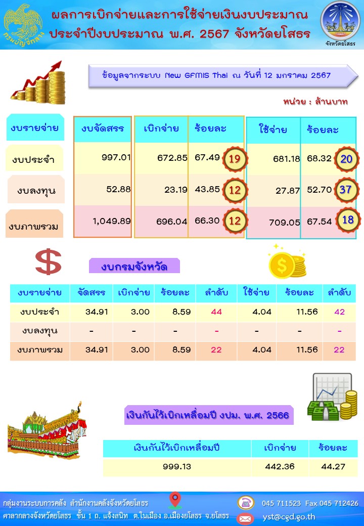 รายงานผลการเบิกจ่ายและใช้จ่ายเงินงบประมาณของจังหวัดยโสธร ข้อมูล ณ วันที่ 12 มกราคม 2567 สามารถดูได้ตาม (thumbtack) ระบบติดตามสถานะการใช้จ่ายงบประมาณของจังหวัดยโสธร
