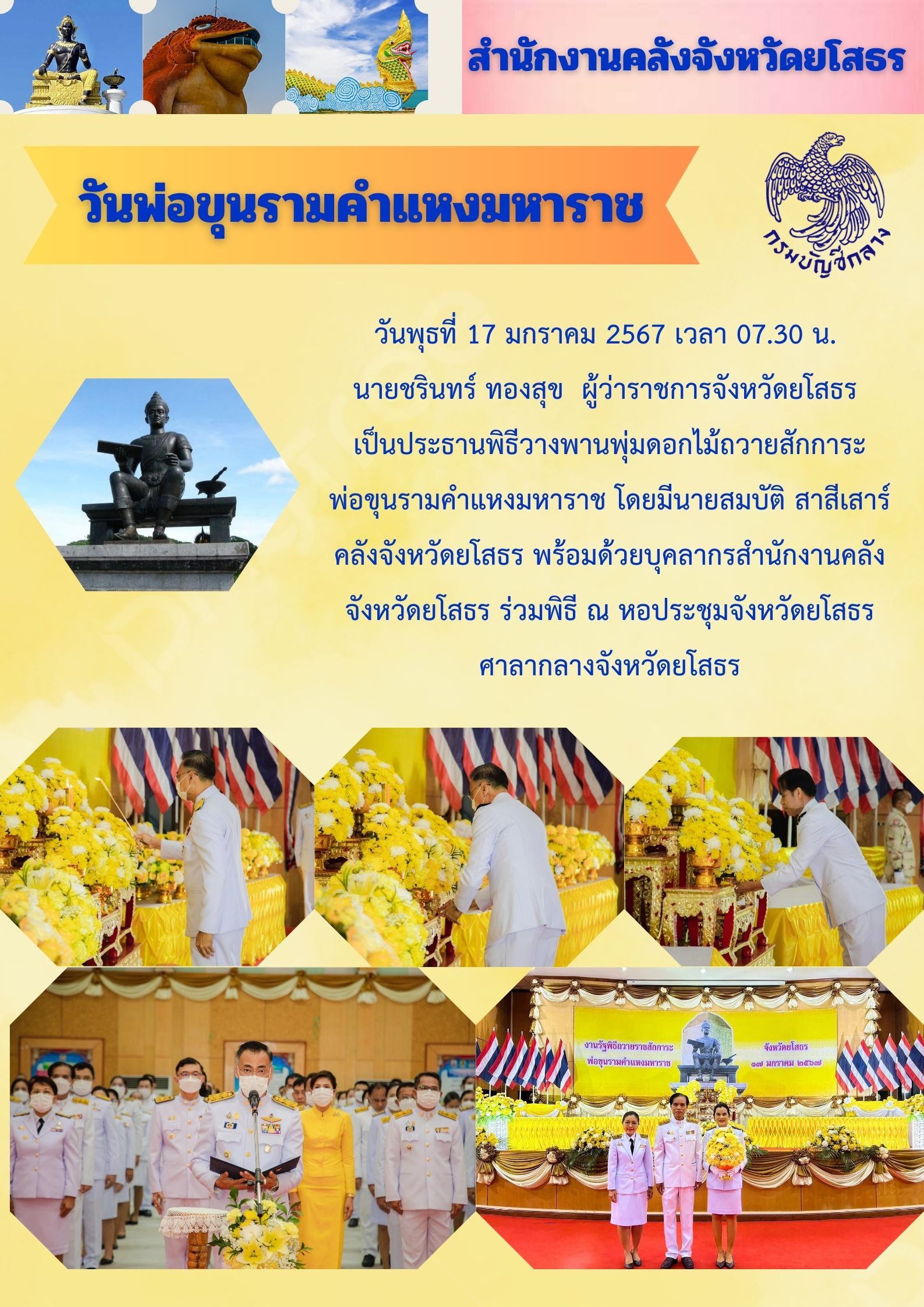 วันพุธที่ 17 มกราคม 2567 เวลา 07.30 น. นายชรินทร์ ทองสุข ผู้ว่าราชการจังหวัดยโสธร เป็นประธานพิธีวางพานพุ่มดอกไม้ถวายสักการะพ่อขุนรามคำแหงมหาราช โดยมีนายสมบัติ สาสีเสาร์ คลังจังหวัดยโสธร พร้อมด้วยบุคลากรสำนักงานคลังจังหวัดยโสธร ร่วมพิธี ณ หอประชุมจัง