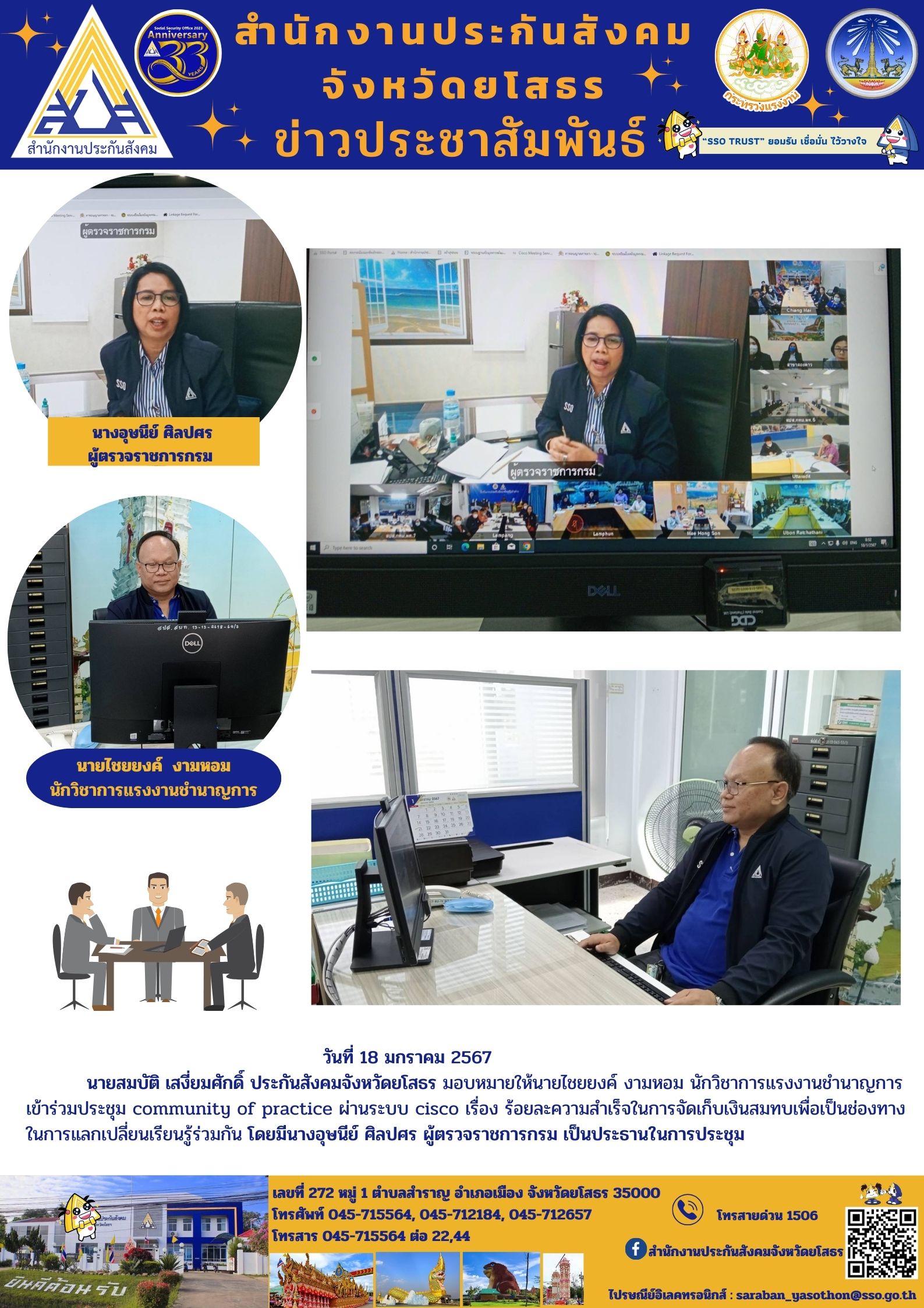 วันที่ 18 มกราคม 2567 นายสมบัติ เสงี่ยมศักดิ์ ประกันสังคมจังหวัดยโสธร มอบหมายให้นายไชยยงค์ งามหอม นักวิชาการแรงงานชำนาญการ เข้าร่วมประชุม community of practice ผ่านระบบ cisco เรื่อง ร้อยละความสำเร็จในการจัดเก็บเงินสมทบเพื่อเป็นช่องทาง ใน