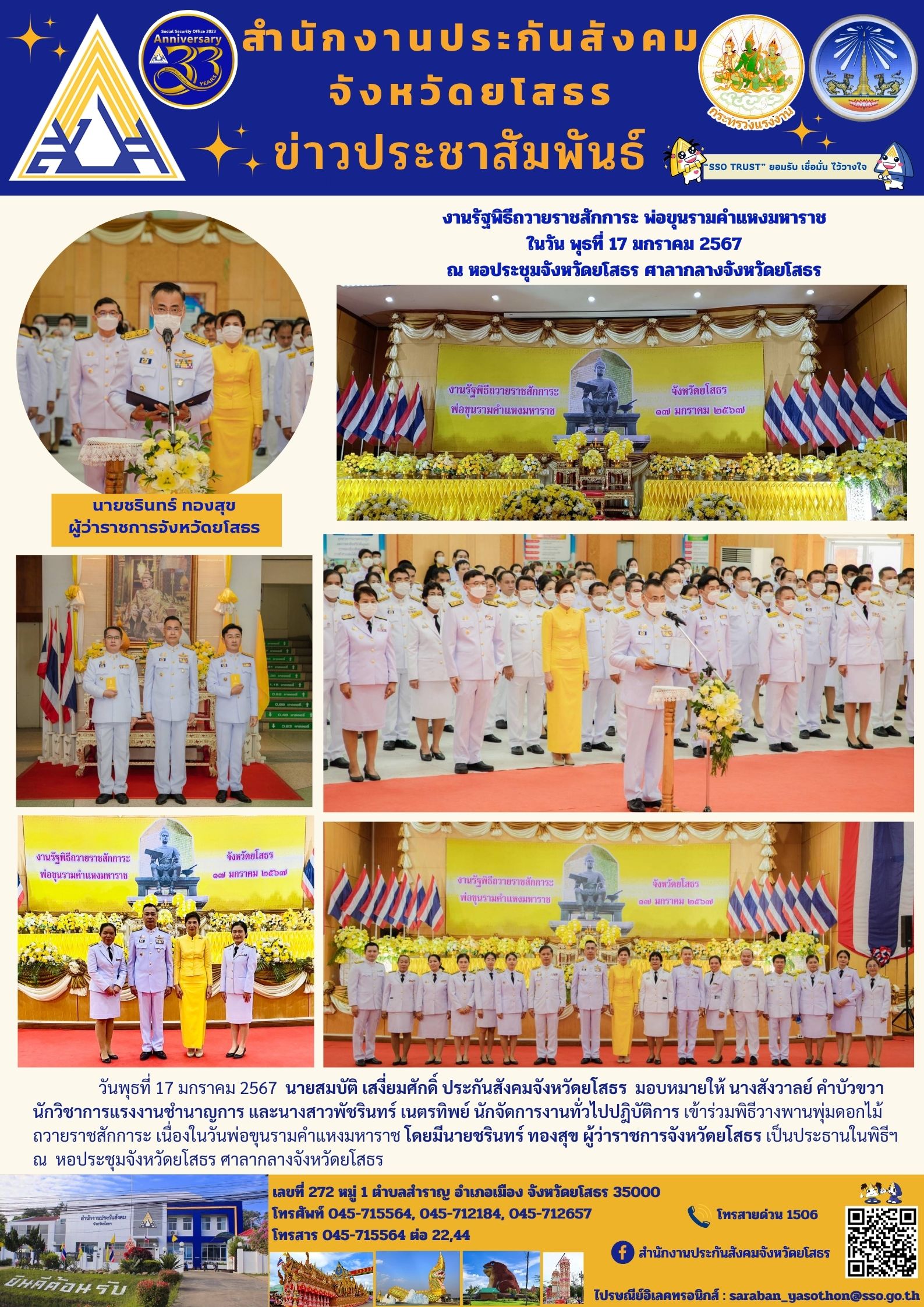 งานรัฐพิธีถวายราชสักการะ พ่อขุนรามคำแหงมหาราช ในวัน พุธที่ 17 มกราคม 2567 ณ หอประชุมจังหวัดยโสธร ศาลากลางจังหวัดยโสธร