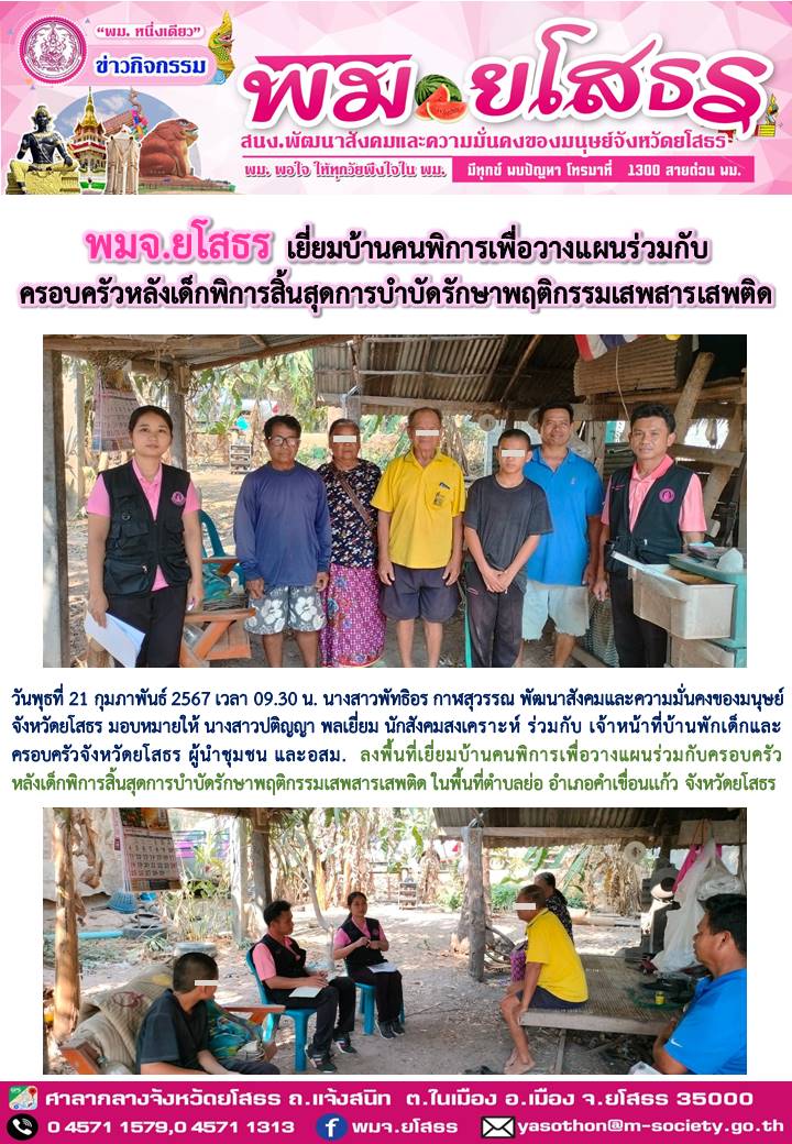 พมจ.ยโสธร ลงพื้นที่เยี่ยมบ้านคนพิการเพื่อวางแผนร่วมกับครอบครัว หลังเด็กพิการสิ้นสุดการบำบัดรักษาพฤติกรรมเสพสารเสพติด (21 กุมภาพันธ์ 2567)