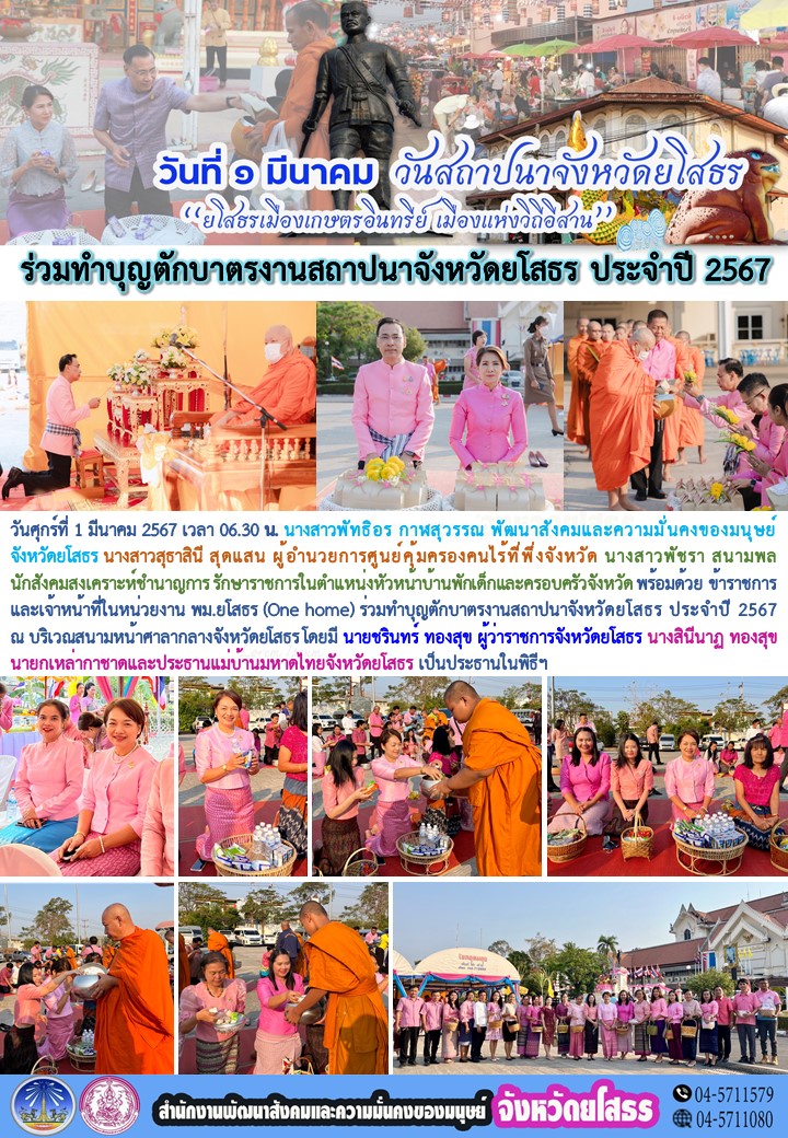 พม.ยโสธร ร่วมทำบุญตักบาตรงานสถาปนาจังหวัดยโสธร ประจำปี 2567 (1 มีนาคม 2567)