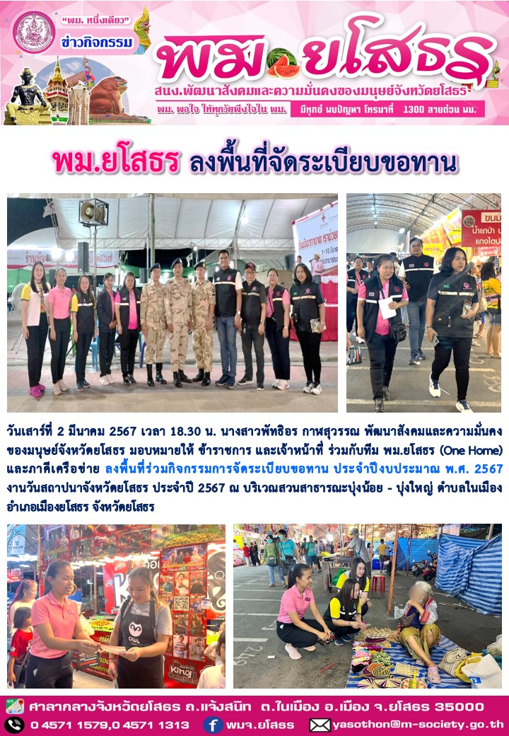 พม.ยโสธร ลงพื้นที่ร่วมกิจกรรมการจัดระเบียบขอทาน ประจำปีงบประมาณ พ.ศ. 2567 งานสถาปนายโสธร (2 มีนาคม 2567)
