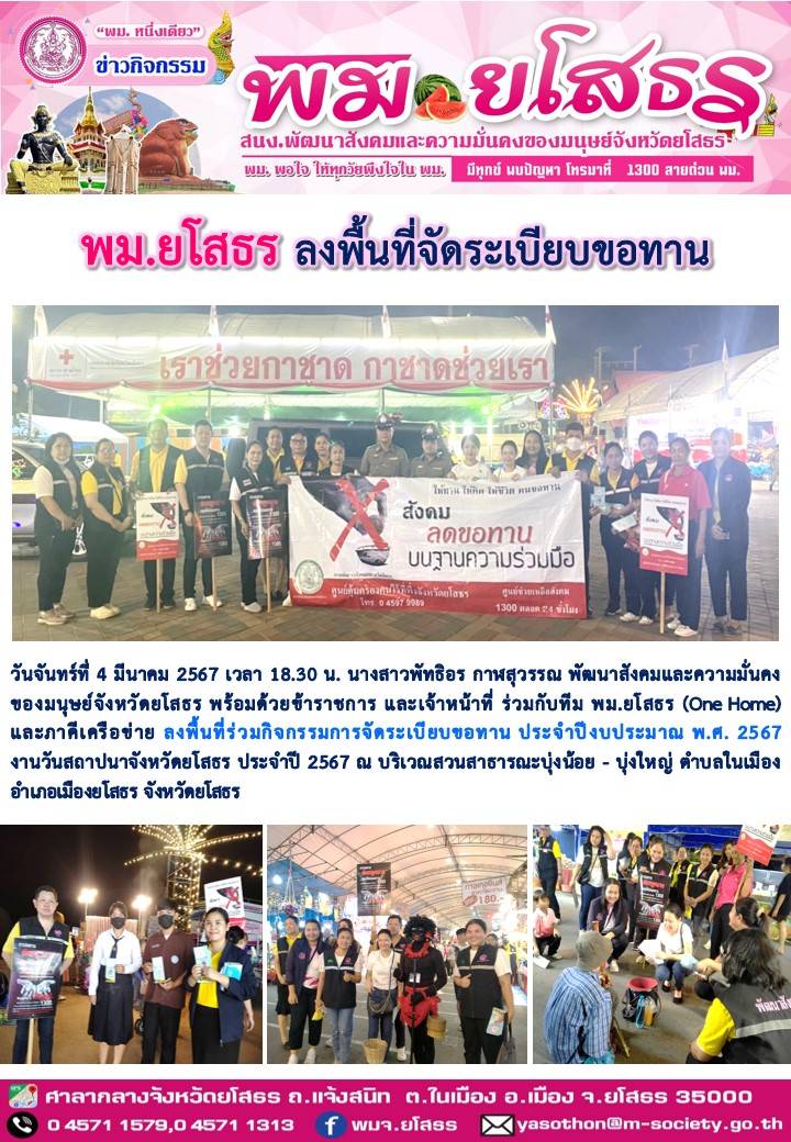 วันที่ 30 เม.ย. 2567 (11:30 น.)วันจันทร์ที่ 4 มีนาคม 2567 เวลา 18.30 น. นางสาวพัทธิอร กาฬสุวรรณ พัฒนาสังคมและความมั่นคง ของมนุษย์จังหวัดยโสธร พร้อมด้วยข้าราชการ และเจ้าหน้าที่ ร่วมกับทีม พม.ยโสธร (One Home) และภาคีเครือข่าย ลงพื้นที่ร่วมกิจกรรมการจัดระเบียบขอทาน ประจำปีงบประมาณ พ.ศ. 2567 งานวันสถาปนาจังหวัดยโสธร ประจำปี 2567 ณ บริเวณสวนสาธารณะบุ่งน้อย - บุ่งใหญ่ ตำบลในเมือง อำเภอเมืองยโสธร จังหวัดยโสธร