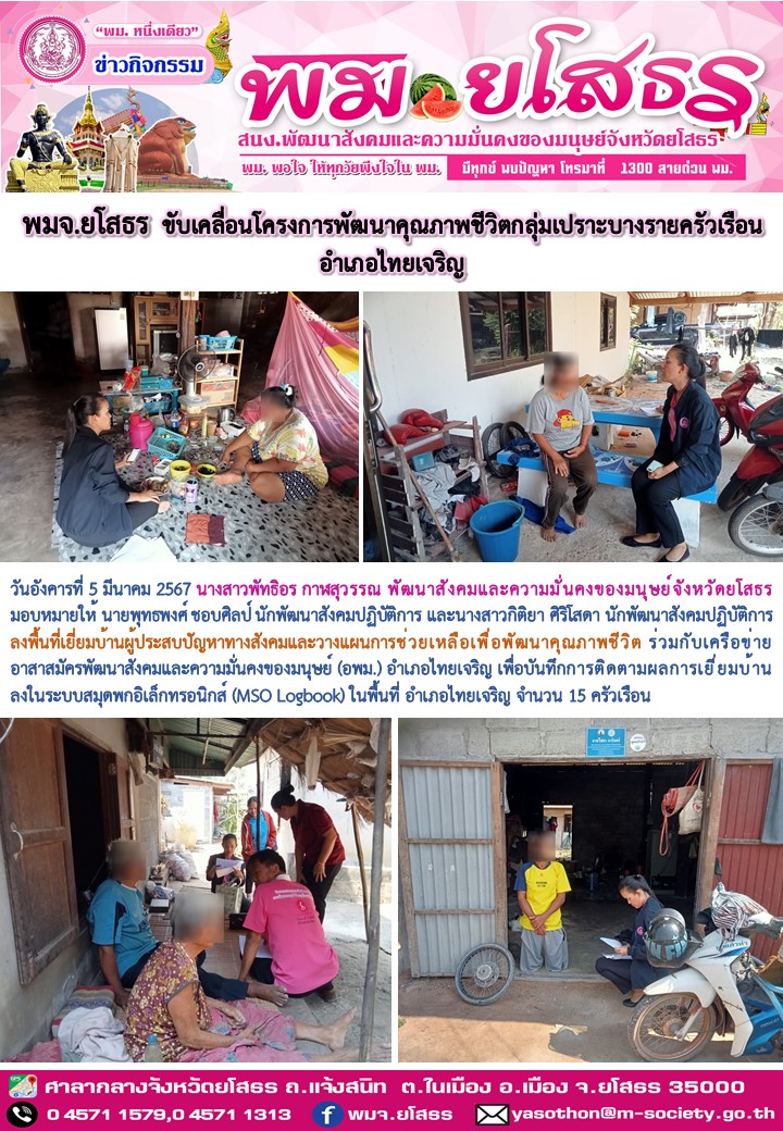 พมจ.ยโสธร ขับเคลื่อนโครงการพัฒนาคุณภาพชีวิตกลุ่มเปราะบางรายครัวเรือน อำเภอไทยเจริญ (5 มีนาคม 2567)